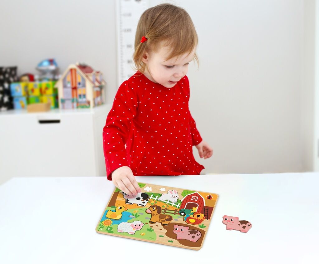Jaký to krásný pohodový den na farmě. Toto vkládací puzzle přináší skvělou možnost, jak u našich nejmenších trénovat jemnou motoriku, trpělivost a poznávání zvířátek. Skládá se ze základny a 7 odnímatelných dílků. Hračka je vyrobena z kvalitního FSC dřeva. Má krásné ilustrace, díky kterým může také posloužit jako milá dekorace v dětském pokojíčku. Hlavní vlastnosti:•obsahuje 7 vkládacích dílů•rozvíjí smyslové dovednosti•procvičuje jemnou motoriku a trpělivost•pestrobarevná ilustrace Značka a certifikát FSC® (Forest Stewardship Council) zaručuje, že dřevo, ze kterého byl produkt vyroben, nebylo vytěženo nelegálně a pochází z lesů obhospodařovaných šetrným či přírodě blízkým způsobem, ve kterém jsou dodržovány přísné environmentální a sociální požadavky. Značka FSC® na výrobku znamená, že svým nákupem pomáháte chránit lesy a podporujete šetrné, odpovědné či přírodě blízké hospodaření, díky kterému jsou naše lesy stabilnější, zdravější, mají přirozenou druhovou skladbu a lépe odolávají negativním následkům klimatických změn.