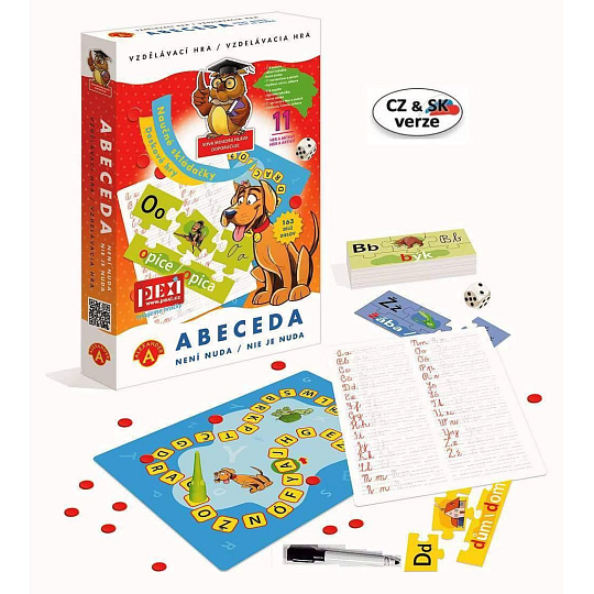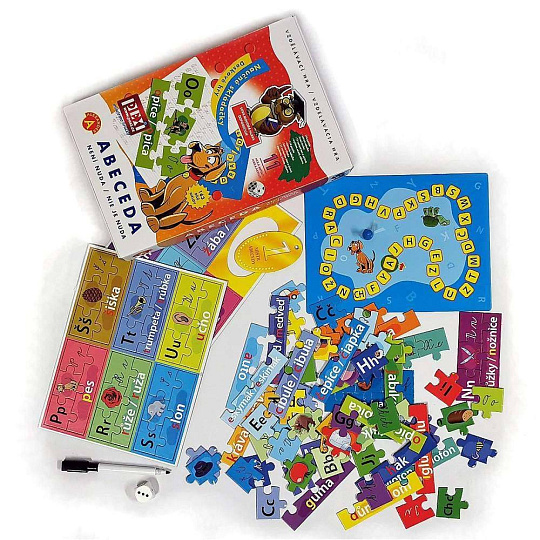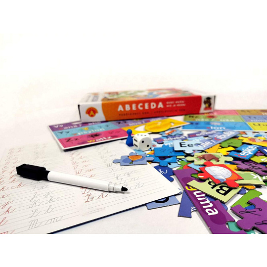 "Abeceda není věda" je skvělá zábava a zároveň učební pomůcka pro děti v předškolním věku a v 1. třídě. Balení obsahuje 29 sad puzzle, které znázorňují jednotlivá písmenka abecedy. Každá sada puzzle se skládá z obrázku, dílku s jeho názvem a dvou dílků s tiskacími a psacími písmenky. Pestré aktivity, během kterých je třeba různě uspořádat dílky, pomáhají dětem naučit se abecedu, učí je rozpoznávat písmenka, jejich pořadí v abecedě, vyhledat první písmenka ve slově a procvičují paměť a koncentraci. Přiložená stírací tabulka umožňuje opakovaně psát a mazat a procvičovat naučená písmenka i zlepšovat jemnou motoriku. Rozměr krabičky: 19 x 29 x 4 cm Vhodné pro děti od 4 let