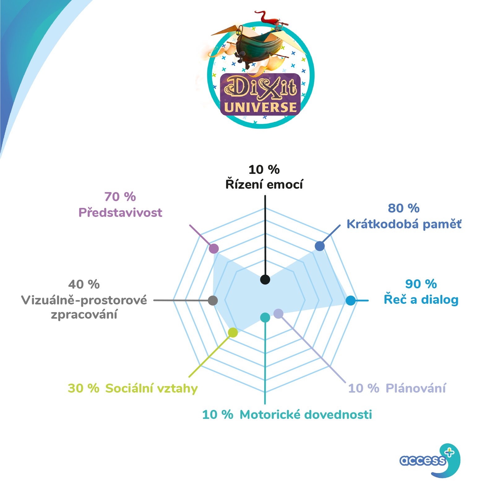 Populární hry Dixit a Stella - Dixit Universe jsou nyní k dispozici ve verzi Access+! Díky upraveným materiálům a pravidlům se může do zábavy zapojit každý. Zvolte si úroveň obtížnosti, preferovaná pravidla a hra může začít! Pomocí hlasovacích karet přiřaďte k uvedenému slovu tři obrázkové karty, které ho nejlépe ilustrují. Je to zábavný způsob, jak si procvičit mentální představivost, řeč a mluvení a zároveň se skvěle pobavit.