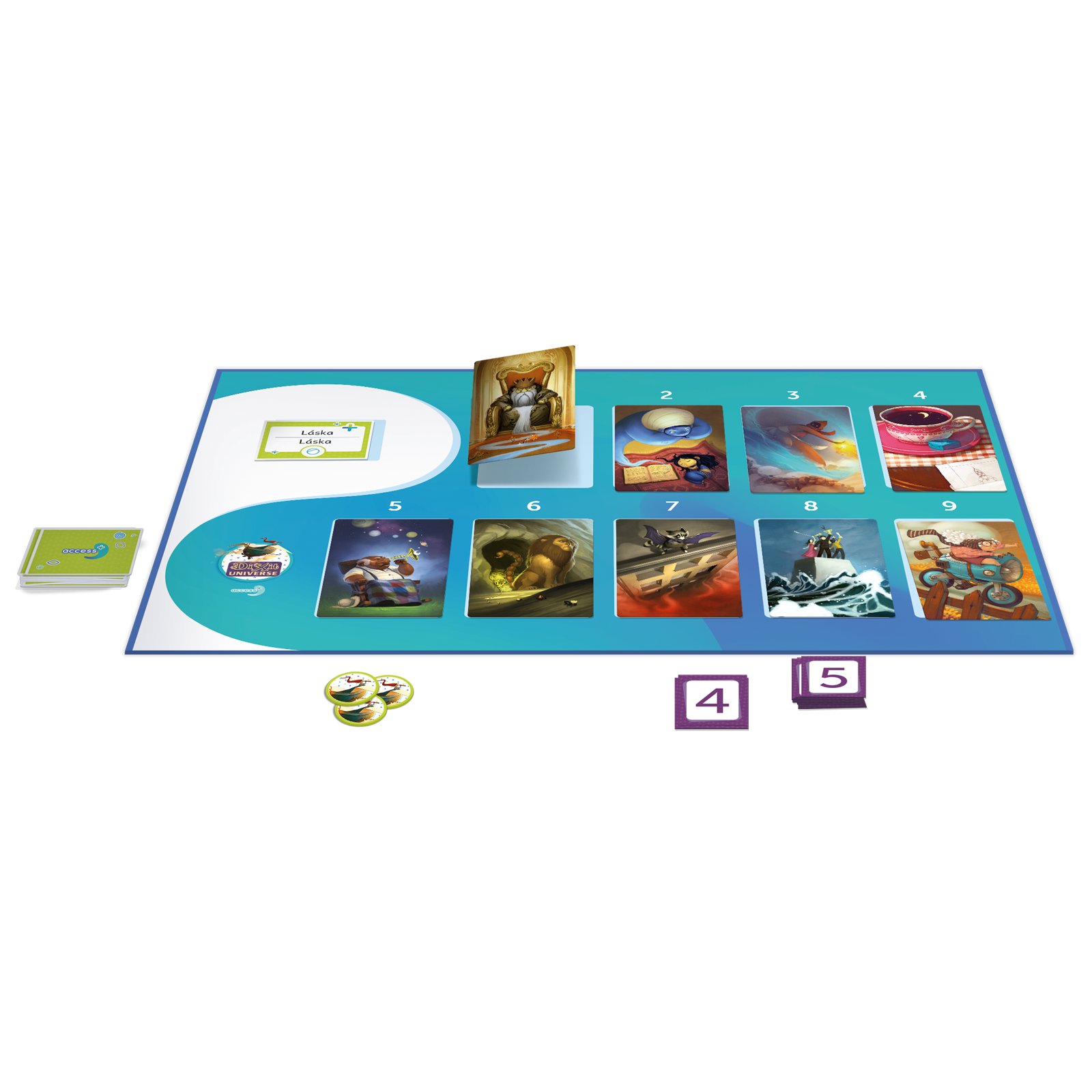 - 1 herní deska Dixit Access+ s 9 číslovanými políčky pro karty s obrázky + 1 políčko pro kartu se slovy