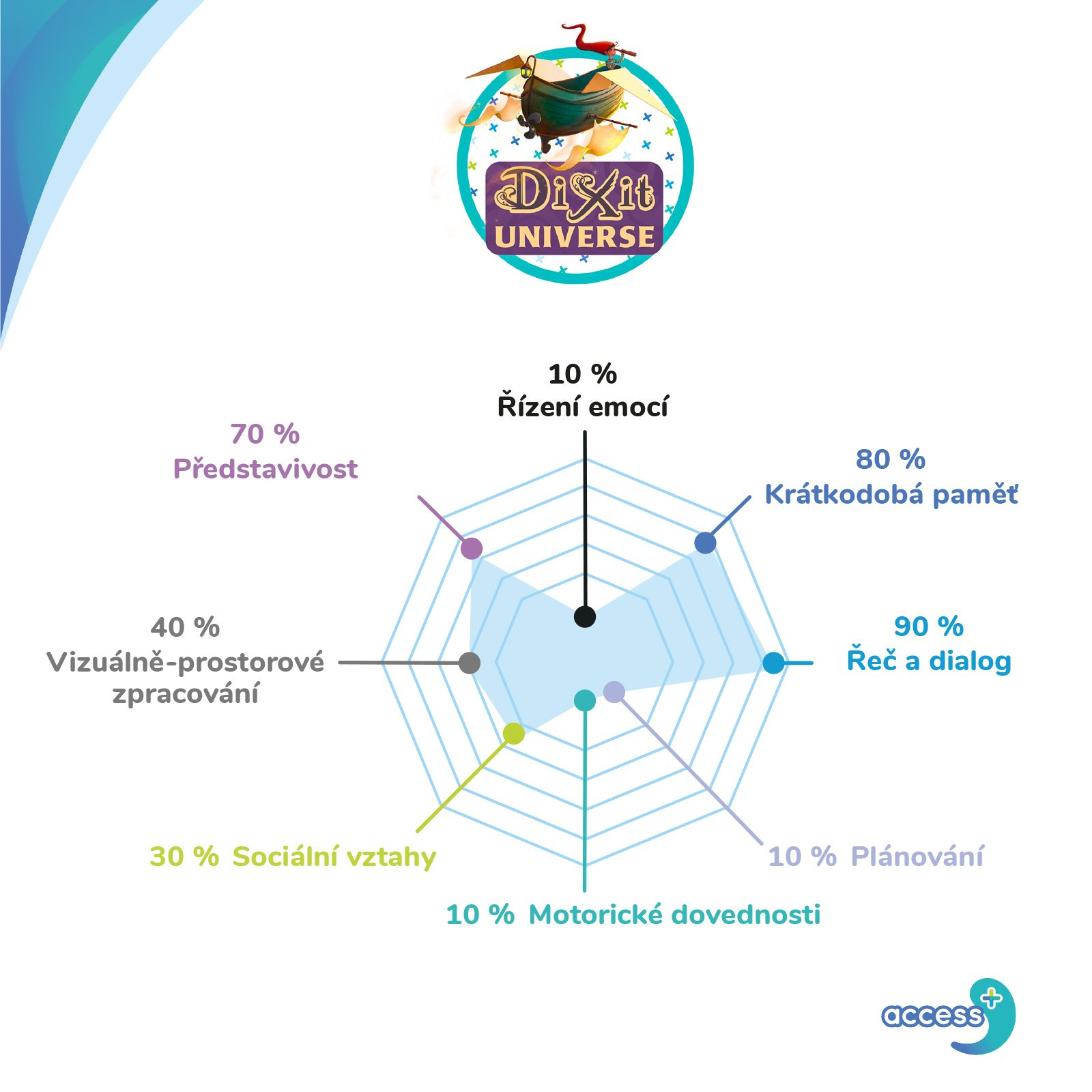 Krátkodobá a pracovní paměť: Pravidla hry Dixit Access+ vyžadují, aby hráč zpracovával dočasné informace. Hráči si musí nejprve uložit slovo z karty se slovy do své krátkodobé paměti a poté se podívat na obrázky na kartách, aby našli asociaci. Během této doby si hráč uchovává slovo ve své pracovní paměti tím, že si ho opakuje v hlavě, nebo si ho vizualizuje v krátkodobé paměti, dokud se nerozhodne pro asociaci.