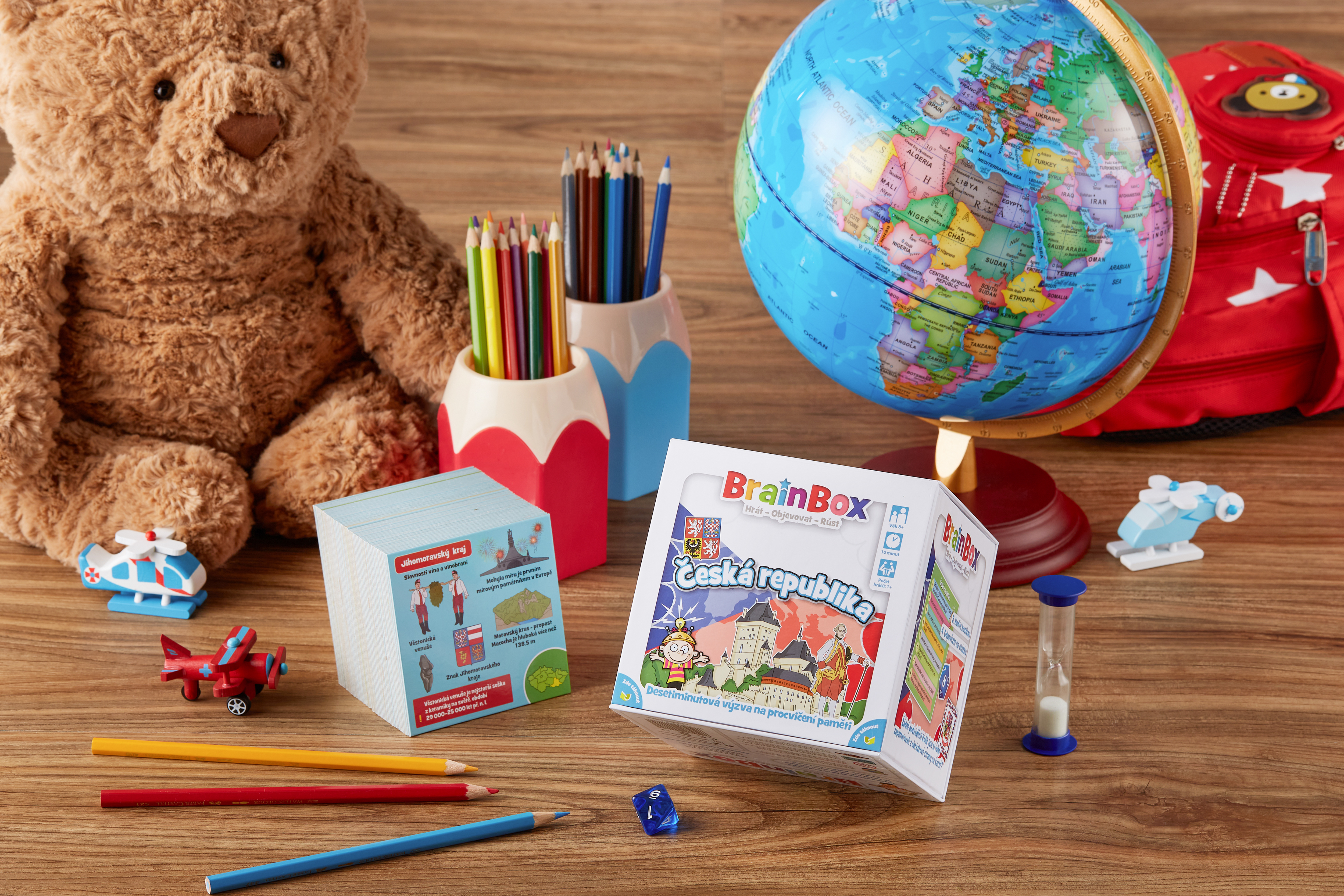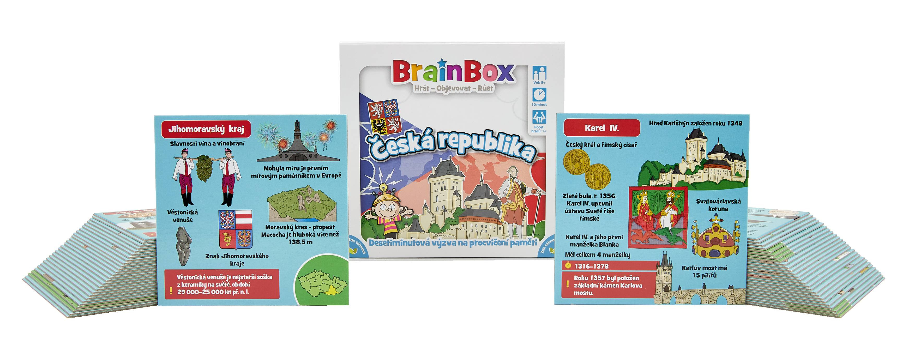 BrainBox Česká republika obsahuje 55 karetních her, z nichž každá představuje nějaký kraj, národní park, významnou oblast nebo osobnost naší země. Na každé kartě jsou údaje o kultuře, zajímavých místech, historii a lidech této oblasti - díky ručně ilustrovaným obrázkům vám vše ožije doslova před očima.