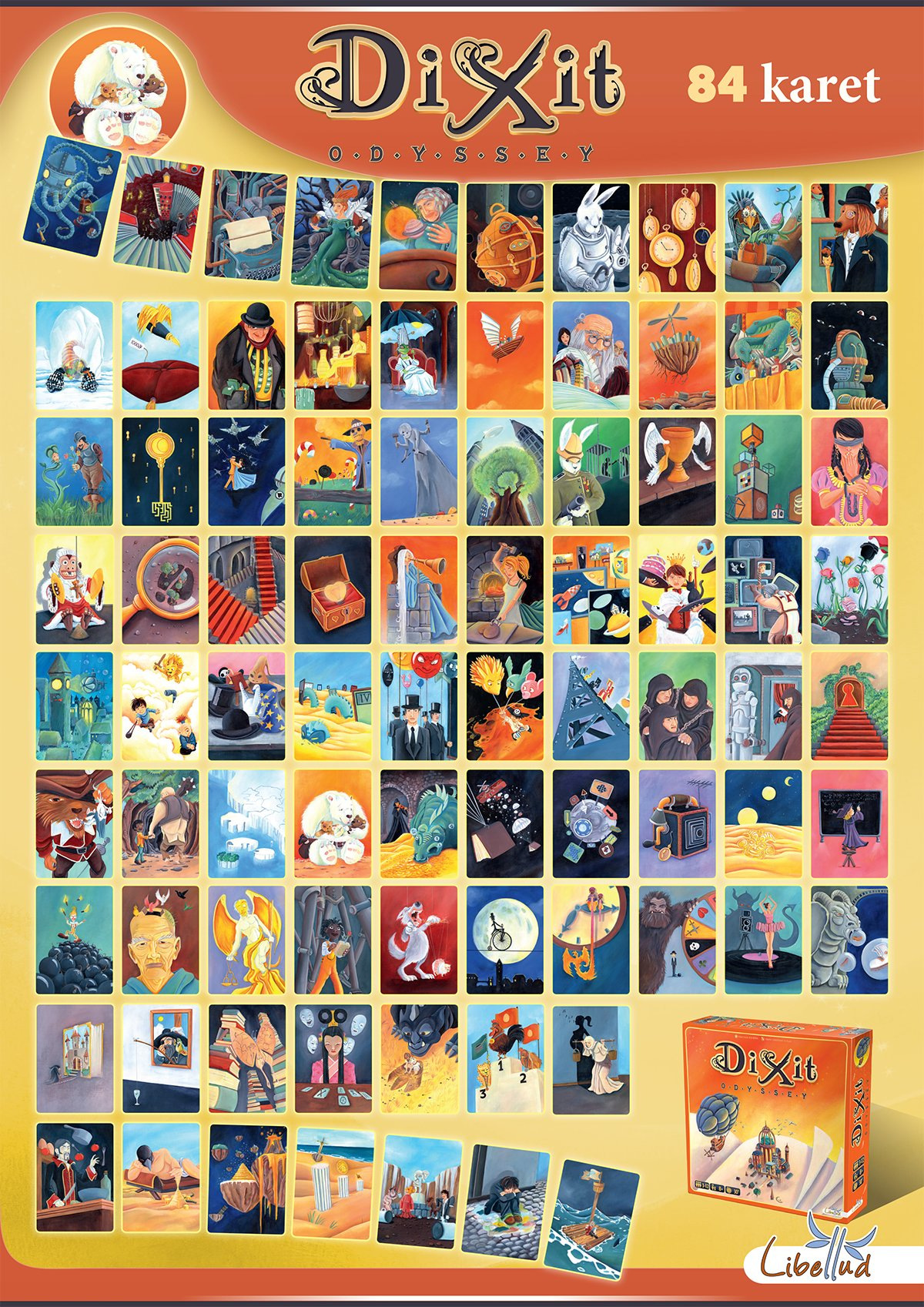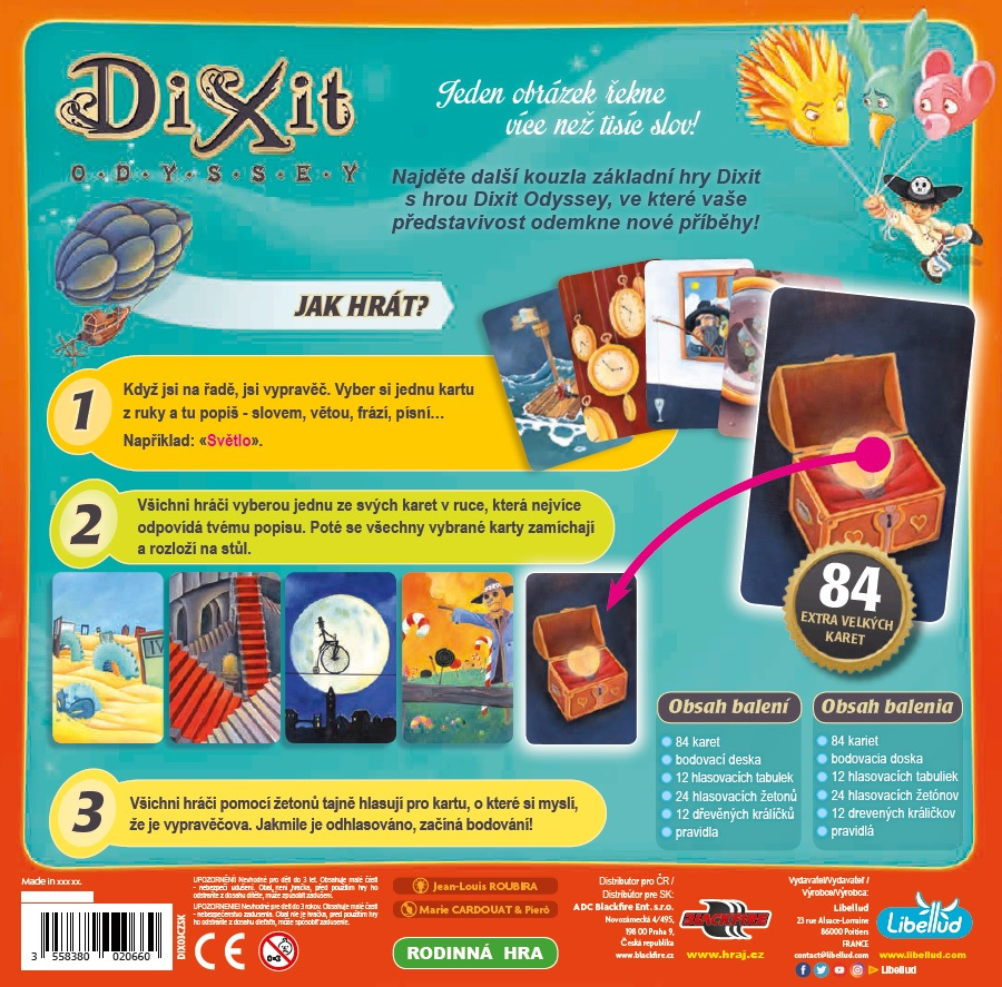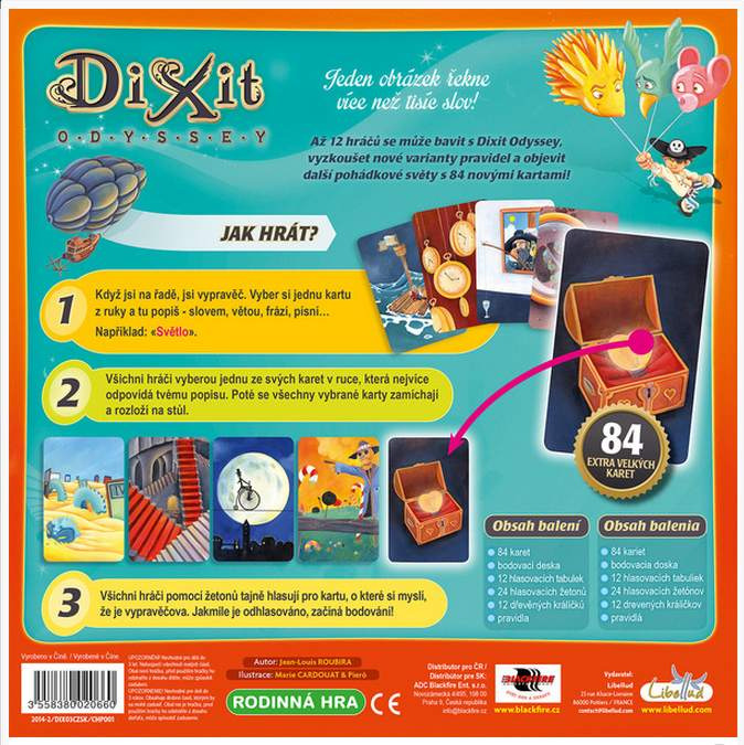 Objevte s Dixit Odyssey kouzlo světa Dixit - oblíbené deskové hry vyznamenané několika prestižními cenami! Odhalte tajemství ukrytá v obrázcích, vyhněte se léčkám svých soupeřů a naplno rozviňte svou fantazii! S touto variantou hry Dixit se můžete bavit až ve 12 hráčích, vyzkoušet nové varianty pravidel a objevit další pohádkové světy!