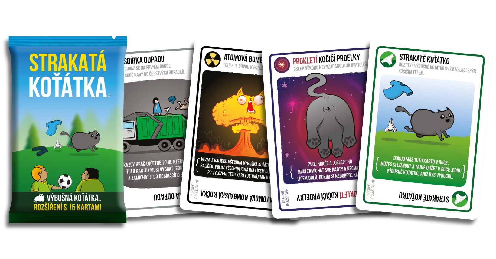 Přichází super várka nových karet do vaší oblíbené kočičí hry! Těšit se můžete třeba na ultimátní Prokletí kočičí prdelky, které zbavuje jednoho hráče možnosti dívat se na své karty. Hlavním vlajkonošem této edice je zajisté Strakaté koťátko a jeho super schopnost držení Výbušného koťátka v ruce. Potěšíme také milovníky pořádných výbuchů - Atomová bombajská kočka - s ní všechna sranda končí… Anebo ne? Strakatá koťátka obsahují 15 nových karet, které musíte mít!