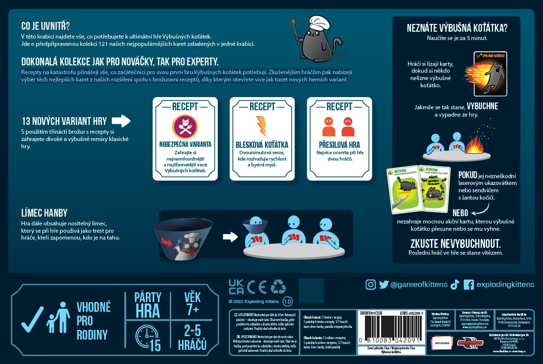 Vhodná pro začátečníky, naučíte se ji během 2 minut - Je to jednoduché! Pokud si vytáhnete výbušné koťátko, prohrajete a jistě vás to zaplaví obrovským smutkem... Všechny ostatní karty v balíčku vám pomohou vyhnout se riziku vytažení výbušného koťátka nebo zneutralizují jeho účinek. Pokud nevybuchnete, VYHRÁLI JSTE!