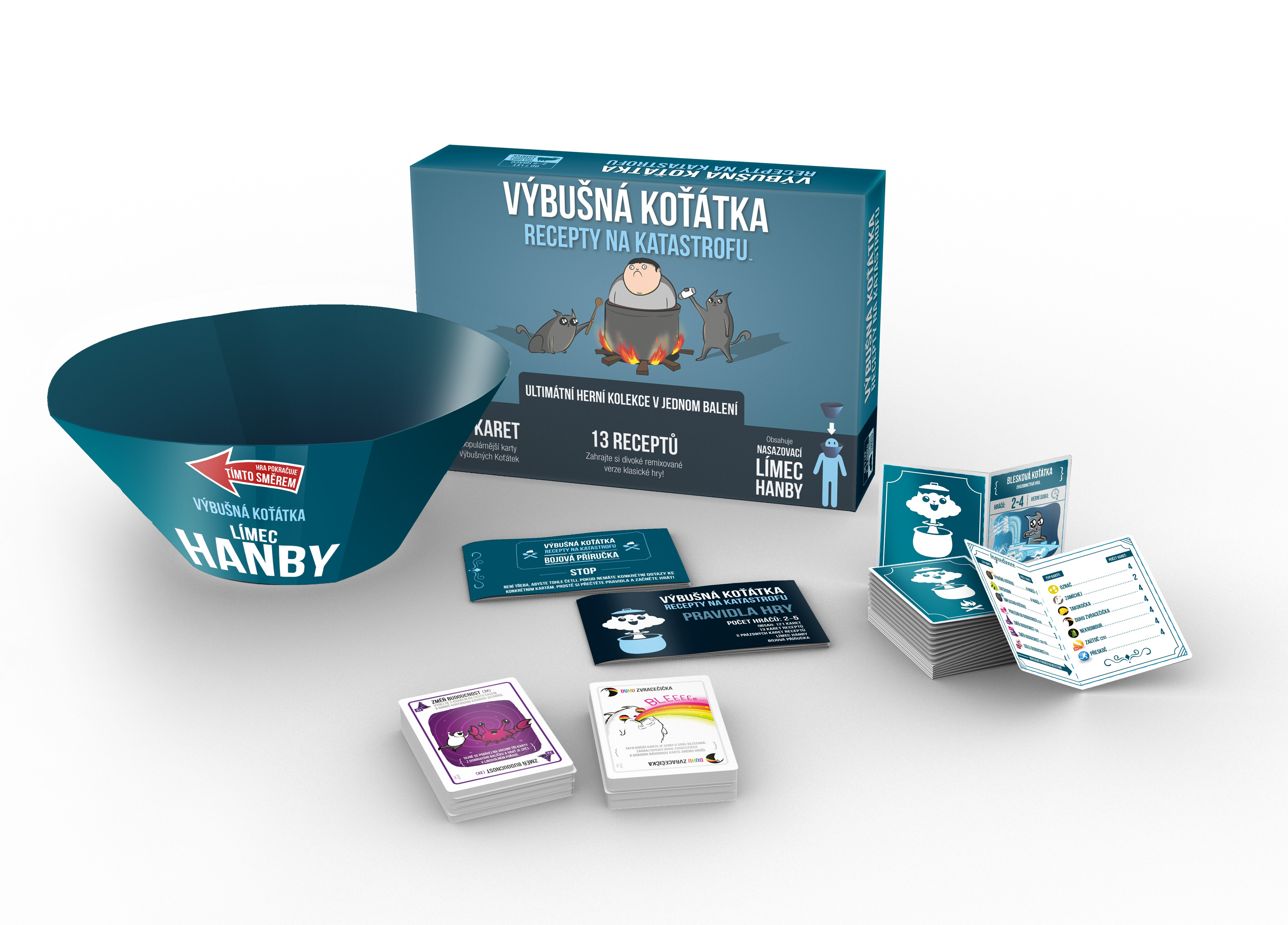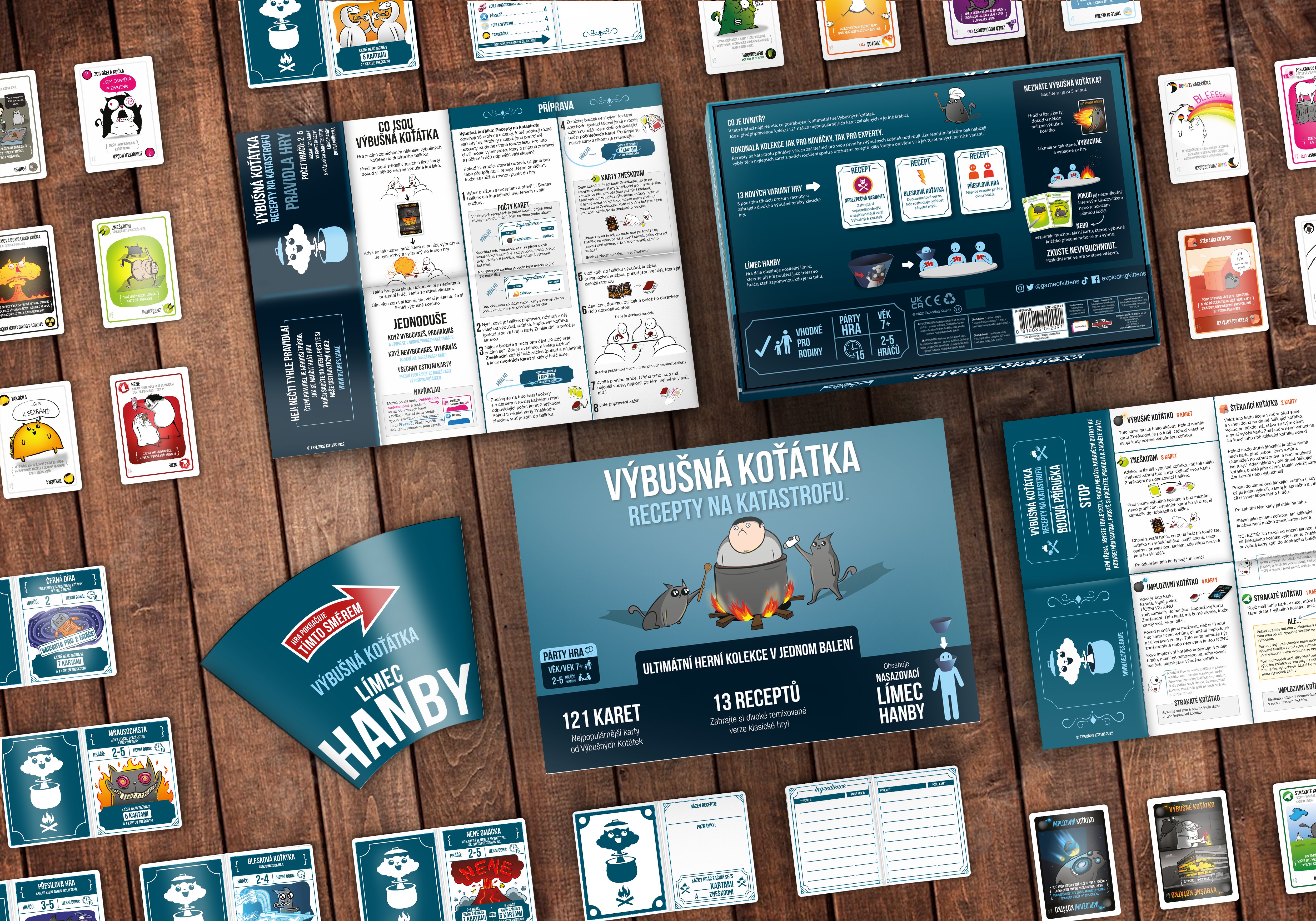 Recepty na katastrofu přinášejí vše, co začátečníci pro svou první hru Výbušných koťátek potřebují. Zkušenějším hráčům pak nabízejí výběr těch nejlepších karet z rozšíření hry spolu s brožurami receptů, díky kterým otevřete více jak tucet nových herních variant.