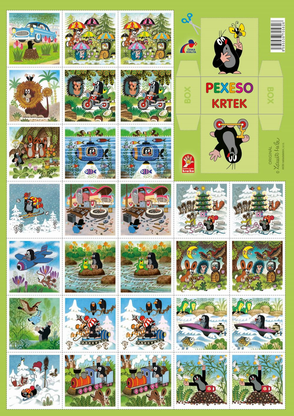 64 kartiček, velikost kartiček 4 x 4 cm, materiál pevný, lesklý karton s voděodpudivou povrchovou úpravou, na přední straně obálky umístěna box k vystřižení pro vložení vystřižených kartiček, na výrobek byla udělena ocenění "česká kvalita" a "bezpečná a kvalitní hračka"