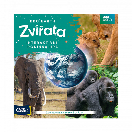 Hra BBC Earth: Zvířata obsahuje herní desku, 4 figurky, 32 obrázkových karet s otázkami, 55 akčních karet zvířat, 12 žetonů s odpověďmi ABC a držák na tablet/telefon.