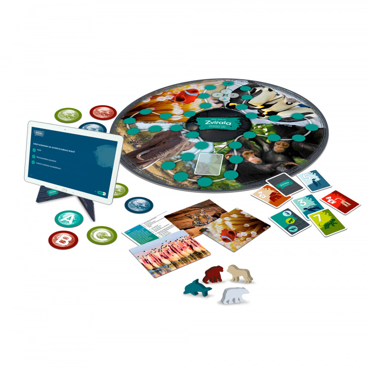Hra BBC Earth: Zvířata obsahuje herní desku, 4 figurky, 32 obrázkových karet s otázkami, 55 akčních karet zvířat, 12 žetonů s odpověďmi ABC a držák na tablet/telefon.