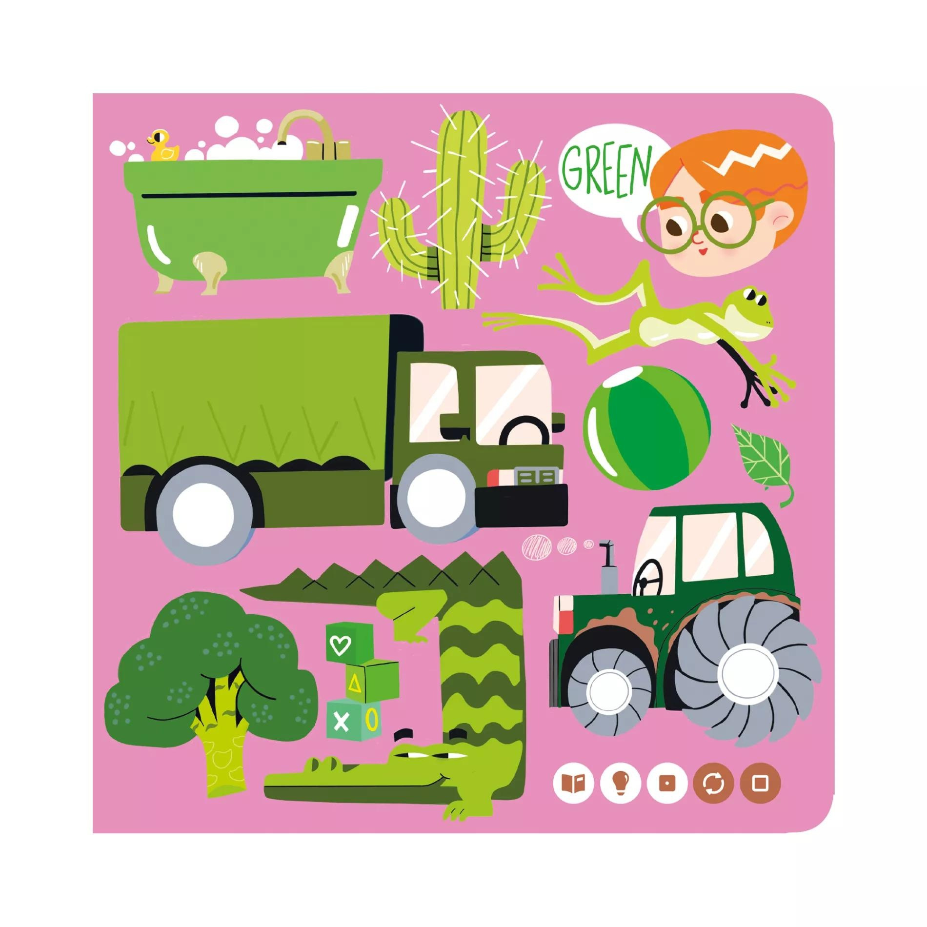 V knize My First Book of Colours z edice English with Ema and Albert se děti od 3 let naučí anglicky pojmenovat barvy, tvary, čísla, hračky, zvířátka, hudební nástroje, dopravní prostředky, oblečení i předměty denní potřeby.