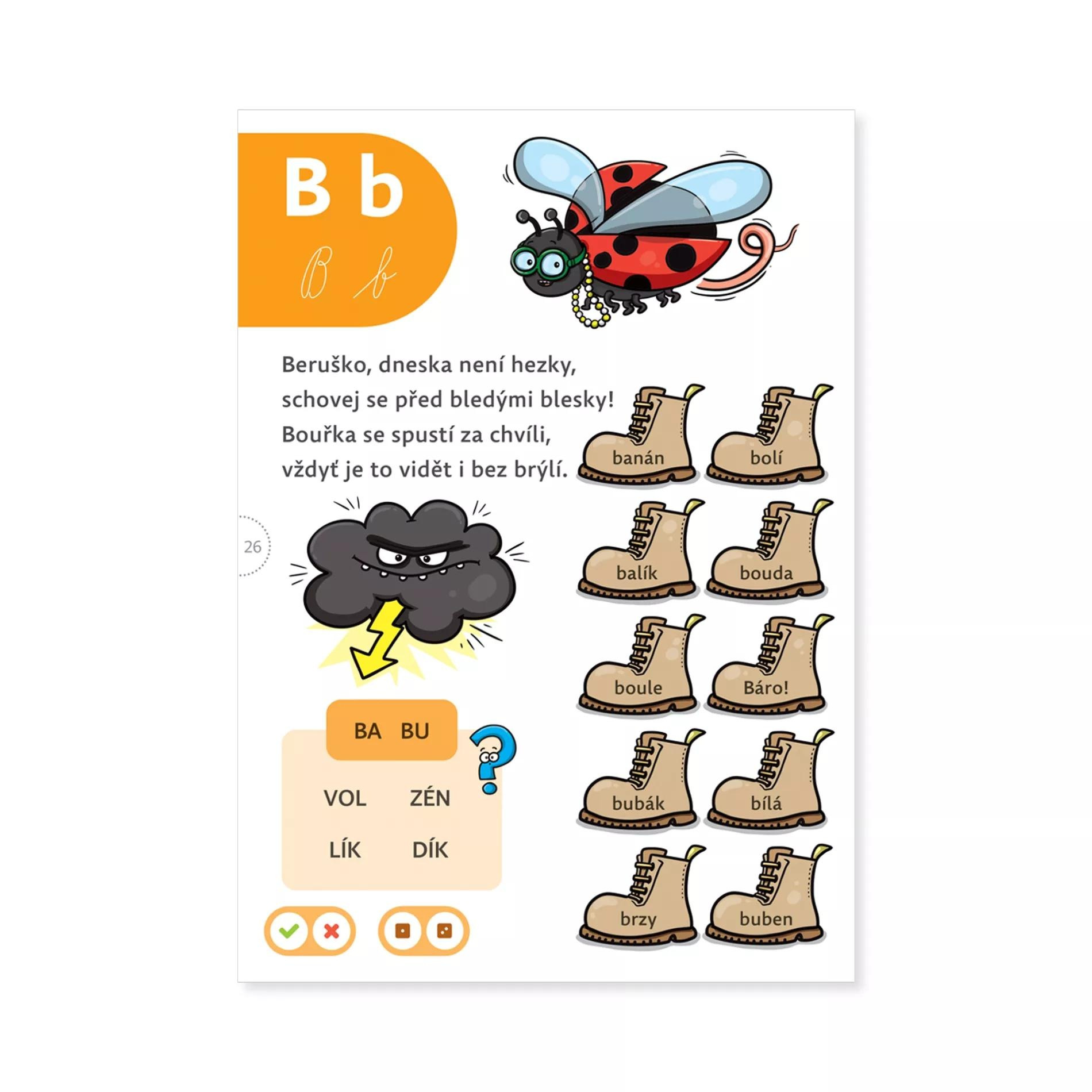 Každé z písmen české abecedy vidí děti ve všech tiskacích i psacích podobách. Jednotlivým samohláskám a souhláskám je věnován vždy ucelený blok zábavných úkolů, které podporují procvičení i upevnění výuky čtení.