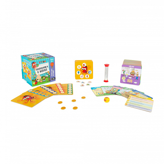 Kvído V kostce obsahuje: 60 karet s obrázky i otázkami k danému tématu, 20 oboustranných bonusových karet pro Kvídovu paměťovku, 4 bodovací karty, 32 obrázkových žetonů pro bonusový úkol, 40 bodovacích žetonů, 1 přesýpací hodiny na 15 sekund a 1 Kvídovu hrací kostku.