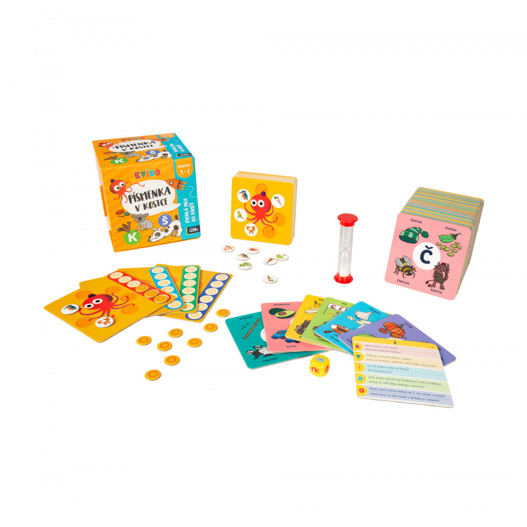 Kvído V kostce obsahuje: 60 karet s obrázky i otázkami k danému tématu, 20 oboustranných bonusových karet pro Kvídovu paměťovku, 4 bodovací karty, 32 obrázkových žetonů pro bonusový úkol, 40 bodovacích žetonů, 1 přesýpací hodiny na 15 sekund a 1 Kvídovu hrací kostku.