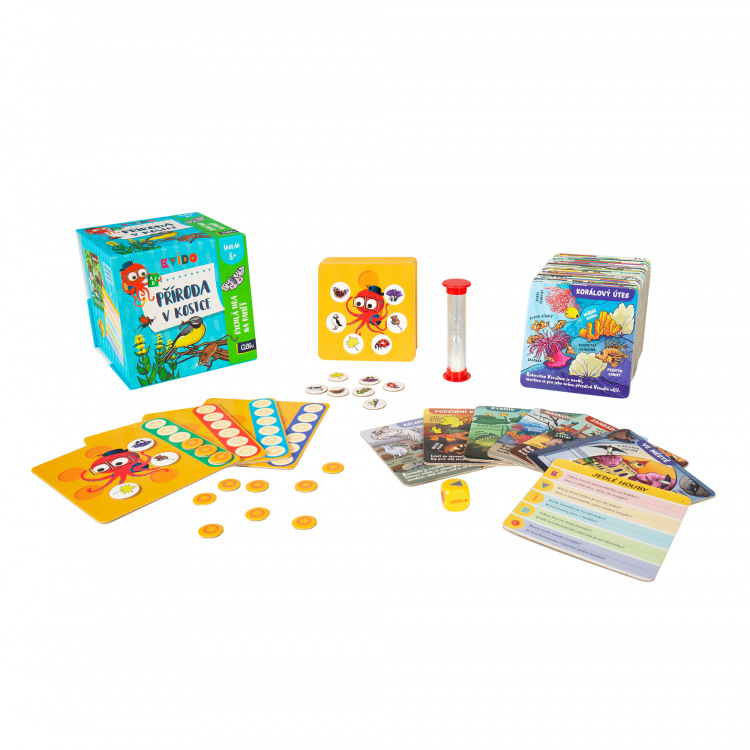 Kvído V kostce obsahuje: 60 karet s obrázky i otázkami k danému tématu, 20 oboustranných bonusových karet pro Kvídovu paměťovku, 4 bodovací karty, 32 obrázkových žetonů pro bonusový úkol, 40 bodovacích žetonů, 1 přesýpací hodiny na 15 sekund a 1 Kvídovu hrací kostku.