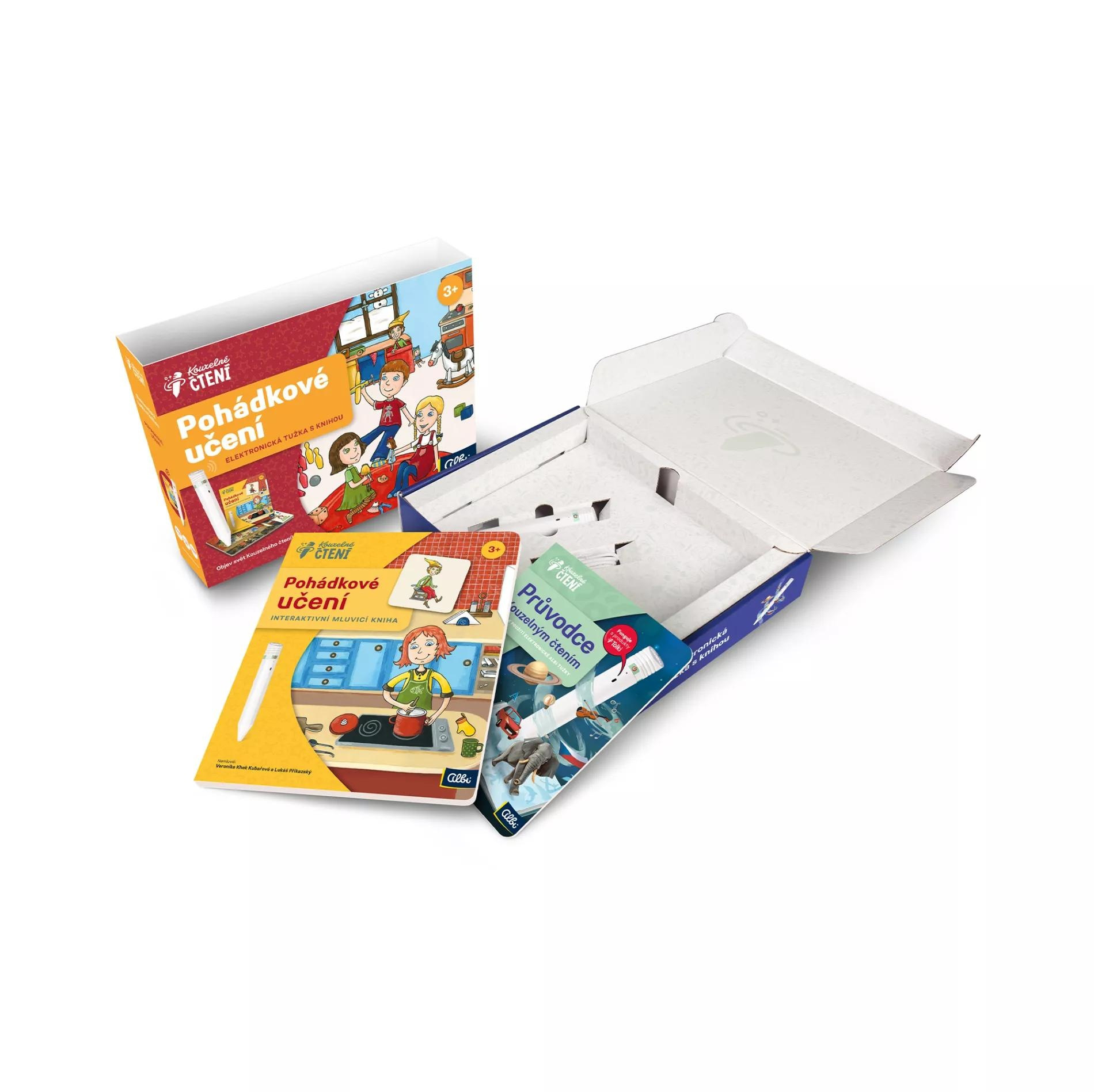 Sada Albi tužka 2.0 s knihou Pohádkové učení obsahuje: elektronickou Albi tužku 2.0, knihu Pohádkové učení, USB-C kabel, Průvodce Kouzelným čtením, 10 kusů samolepek MP3 přehrávače, 10 kusů samolepek ovládání hlasitosti a Audio blok.