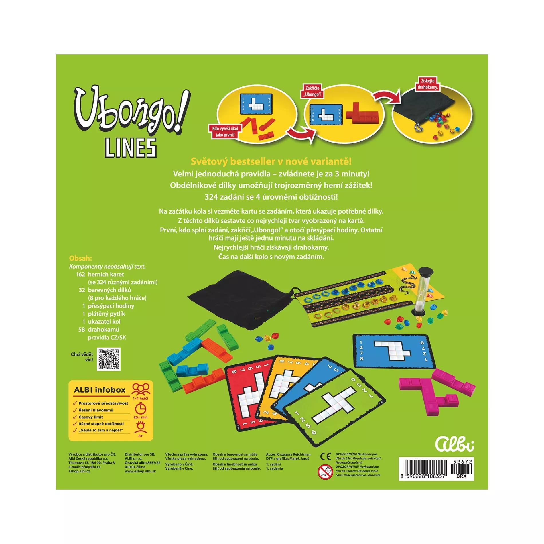 Ubongo Lines! obsahuje 324 zadání se 4 úrovněmi obtížnosti, má velmi jednoduchá pravidla (která se naučíte za 3 minuty) a rozvíjí prostorovou představivost.