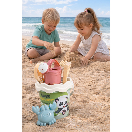 6dílná sada na písek, vyrobená z kvalitních recyklovaných plastů v pastelových barvách v Itálii. Obsahuje: Kyblík, konvičku 0,5 l, sítko, lopatku, hrabičky a tvořítko ve tvaru mořského kraba. Kyblík: průměr 17 cm, výška 16 cm. Sada: výška 32 cm, váha 0,314 kg. Doporučený věk od 10 měsíců.