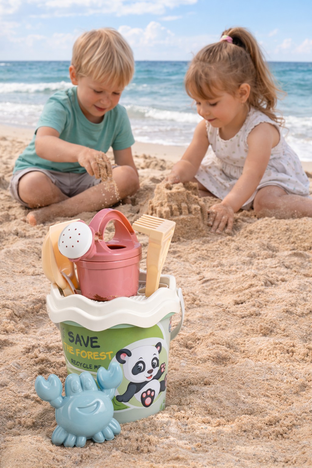 6dílná sada na písek, vyrobená z kvalitních recyklovaných plastů v pastelových barvách v Itálii. Obsahuje: Kyblík, konvičku 0,5 l, sítko, lopatku, hrabičky a tvořítko ve tvaru mořského kraba. Kyblík: průměr 17 cm, výška 16 cm. Sada: výška 32 cm, váha 0,314 kg. Doporučený věk od 10 měsíců.