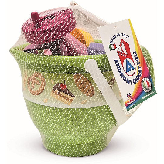 6dílná sada na písek, vyrobená z kvalitních plastů v Itálii. Obsahuje: 1 kyblík na písek ve tvaru vyší mísy s uchem, 1 tvořítko ve tvaru bábovky, 1 tvořítko na dortík, 1 kopečkovač na zmrzlinu a 1 ruční šlehač. Baleno v síťce o rozměrech 18 x 18 x 20 cm. Váha: 0,333 kg. Doporučený věk od 10 měsíců.
