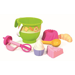 6dílná sada na písek, vyrobená z kvalitních plastů v Itálii. Obsahuje: 1 kyblík na písek ve tvaru vyší mísy s uchem, 1 tvořítko ve tvaru bábovky, 1 tvořítko na dortík, 1 kopečkovač na zmrzlinu a 1 ruční šlehač. Baleno v síťce o rozměrech 18 x 18 x 20 cm. Váha: 0,333 kg. Doporučený věk od 10 měsíců.