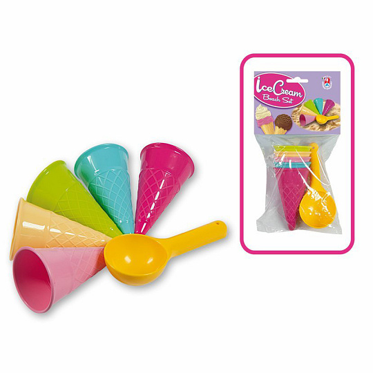 6dílná sada tvořítek na písek - zmrzlina. Vyrobeno v Itálii z kvalitních plastů. Obsahuje pět kornoutků a kopečkovač na zmrzlinu. Baleno v sáčku o rozměrech 15 x 31 cm. Váha: 0,17 kg. Váha: 0,14 kg. Doporučený věk od 12 měsíců.