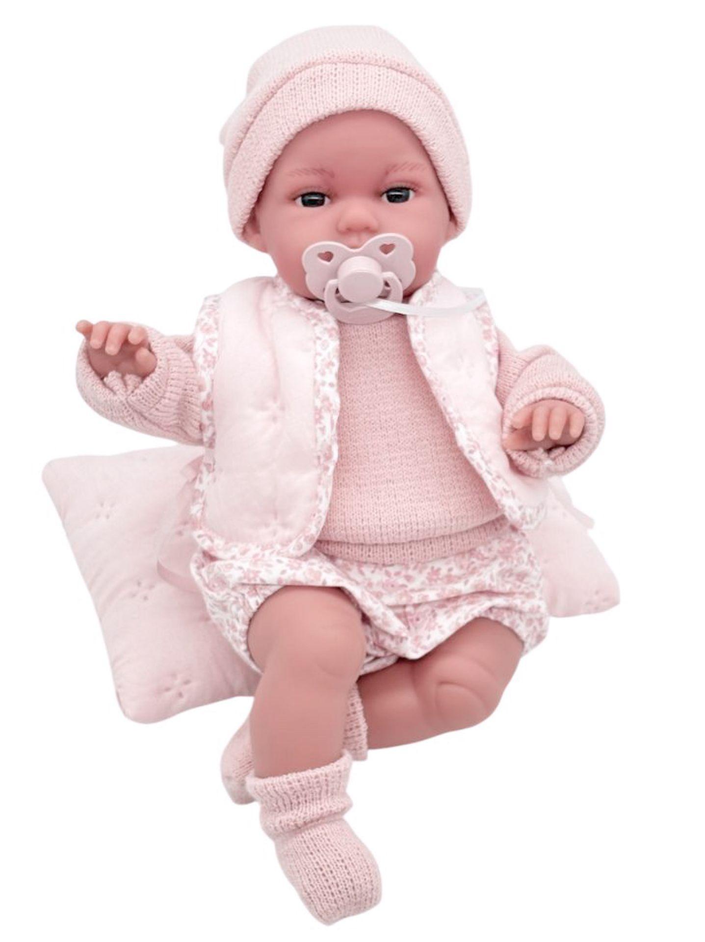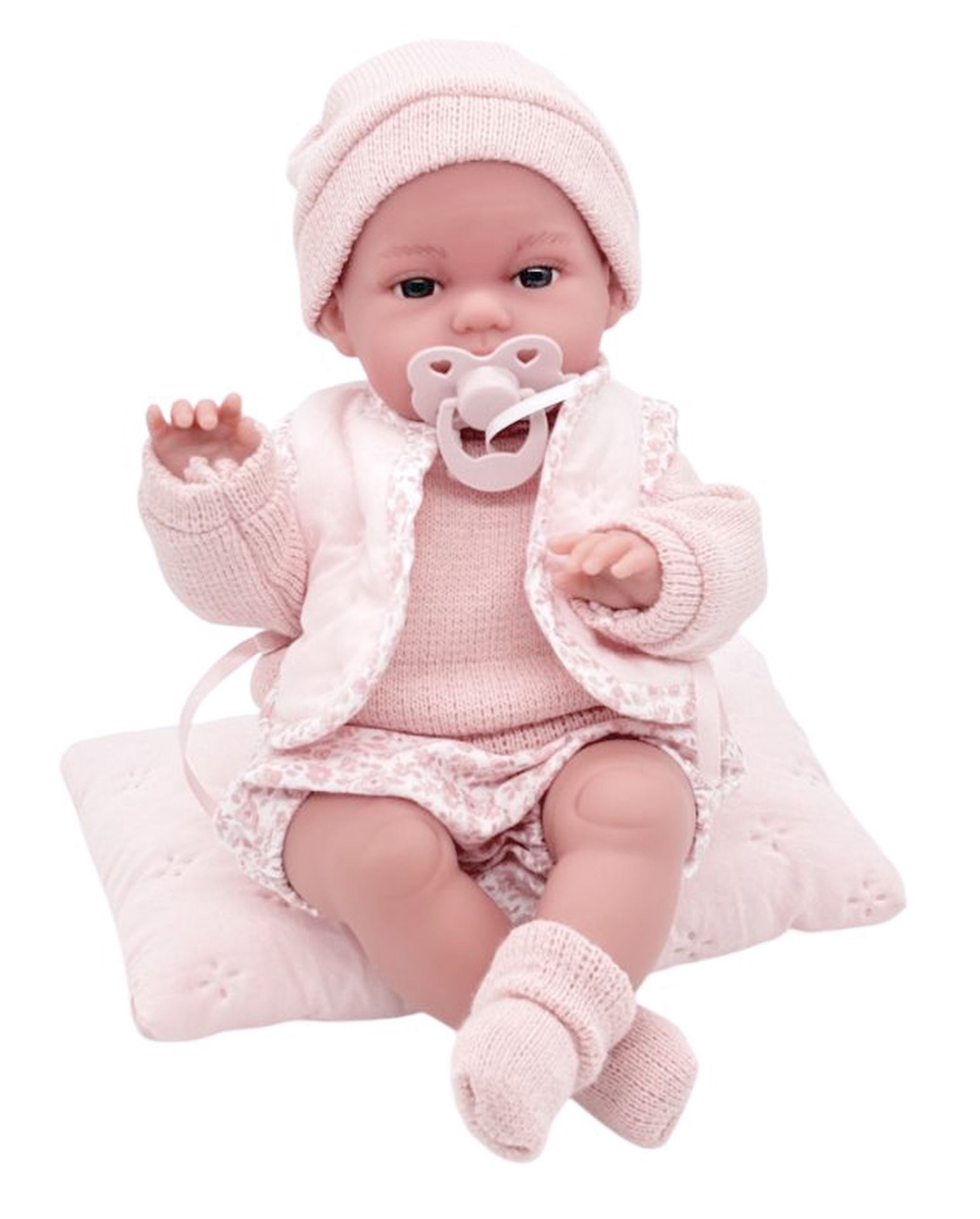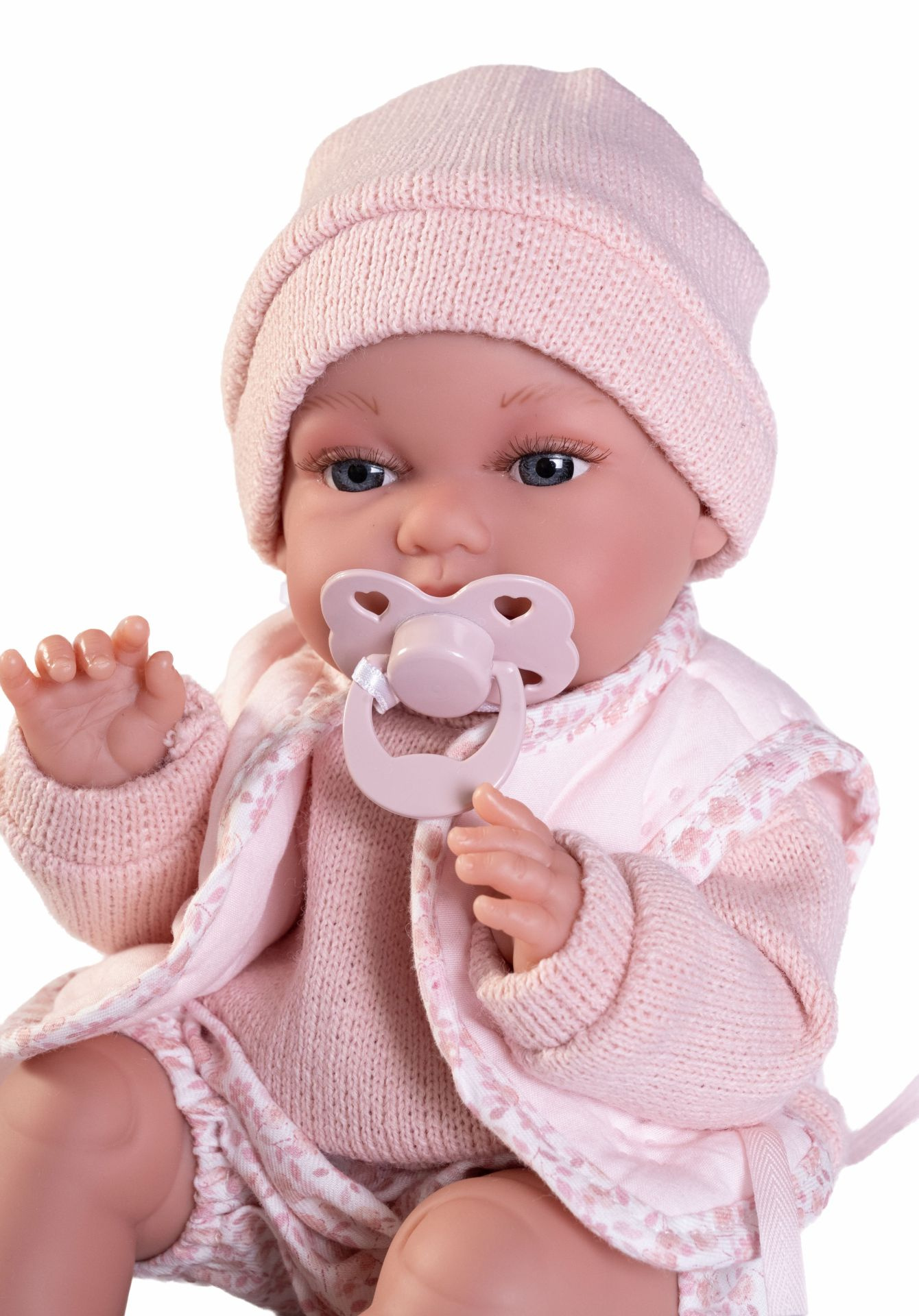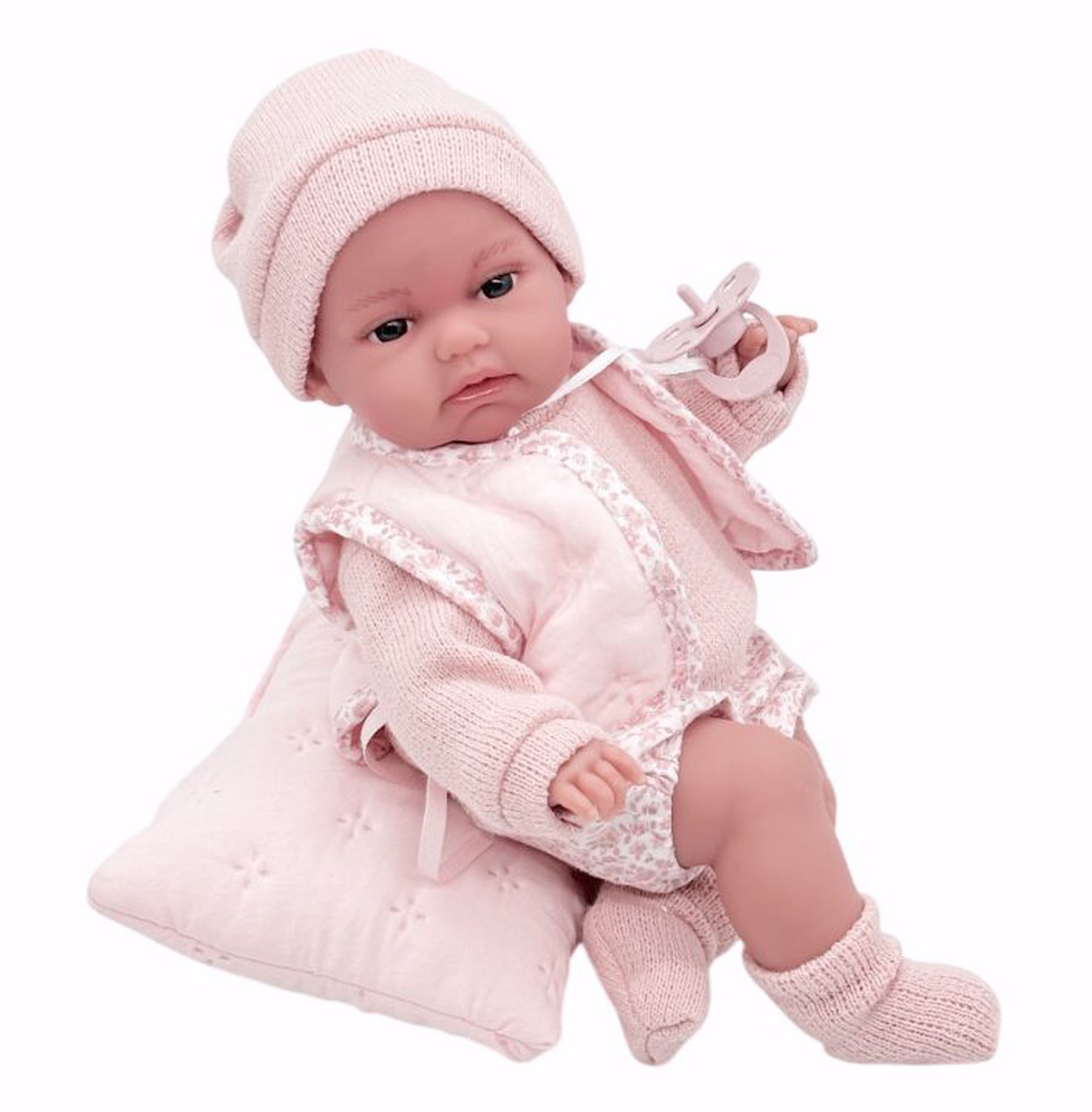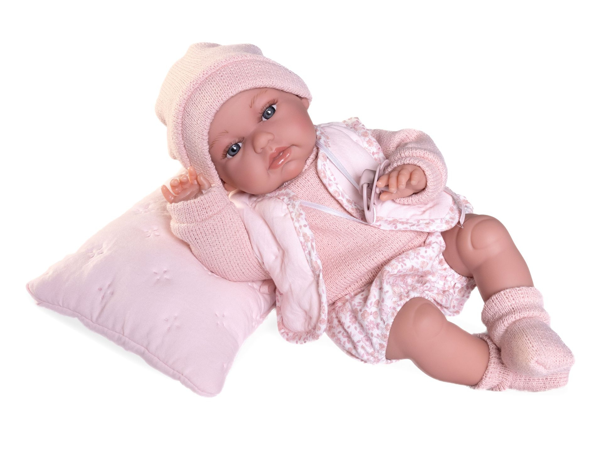 Ručně vyrobená realistická španělská panenka - miminko, se speciální pohybovou funkcí. Díky vnitřní opoře kostry těla, může dělat neobvyklé pohyby končetin, jako překřížit nožičky vleže, dát k sobě dlaně nebo zaujmat různé miminkovské polohy. Miminko má měkké látkové tělo, hlava a končetiny jsou vyrobené z kvalitního měkčeného vinylu. Oblečení některých panenek bylo vyrobeno z organické bavlny, která zaručuje výrobu z ručně sbírané, ekologicky bez chemického ošetření pěstované bavlny. Firma Antonio Juan klade velký důraz na ekologii a proto jako první využívá v tomto odvětví zmíněnou bavlnu. Velikost 34 cm. Baleno v dárkové krabici. Doporučený věk od 3 let.