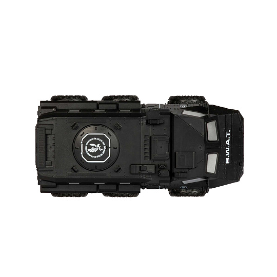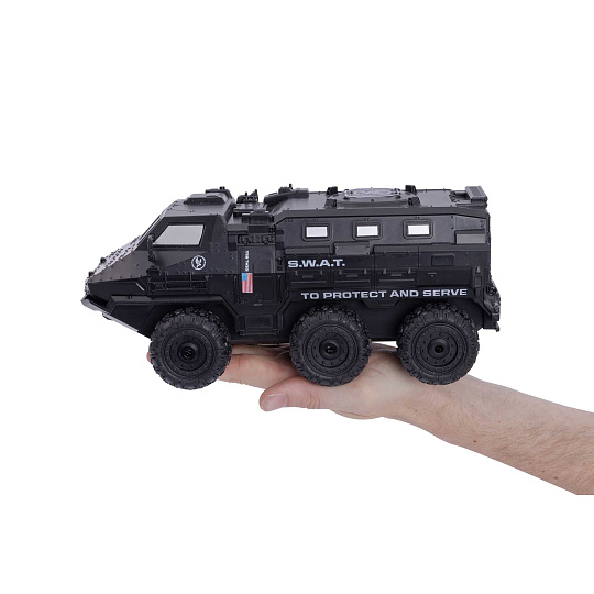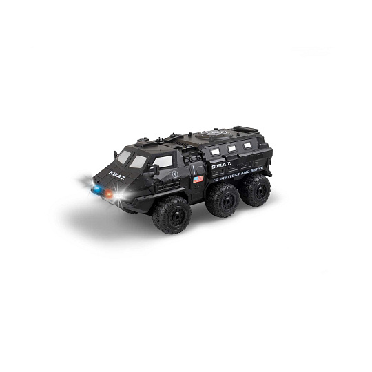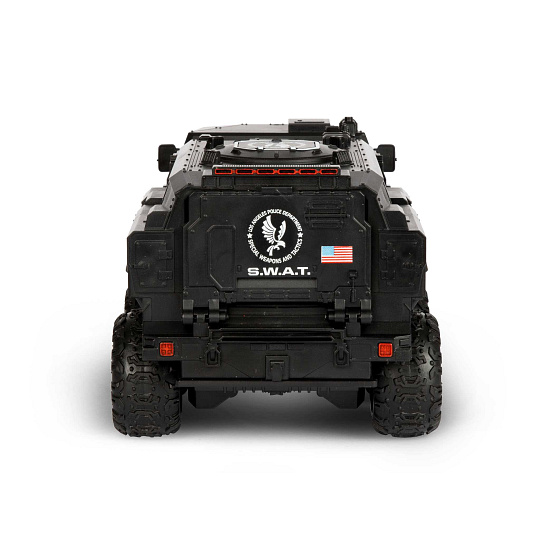 RC Truck S.W.A.T. Tactical Truck je vybaven úžasným předním osvětlením a působivou modrou světelnou lištou v autentickém americkém designu - vaše hra bude ještě poutavější. Rychlost náklaďáku lze pohodlně regulovat dálkovým ovládáním, takže si začátečníci i pokročilí jezdci zachovají plnou kontrolu. Díky působivé době jízdy až 15 minut nestojí nic v cestě dlouhotrvající zábavě při řízení, než se kamion dobije na další dobrodružství.