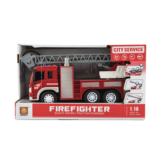 Plastové autíčko pro malé hasiče je vyrobeno z kvalitního plastu. Model jezdí na setrvačník, vydává zvuky a bliká. Auto má vysouvací žebřík a můžete stříkat vodu jako opravdový hasič. Kupte dětem hasičský vůz! Velikost dodávky je 30 cm. Baterie 3x AG13 jsou součástí balení a slouží pouze pro zkušební účely. Auto je vyrobeno z kvalitního a odolného plastu. Rozměry balení 32 x 18 x 12cm. Vhodné pro děti od 3 let.