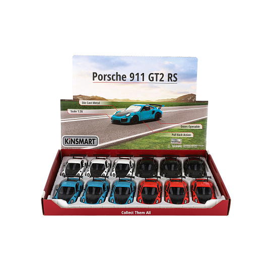 Krásný kovový model auta Porsche 911 GT2 RS v měřítku 1:36. Autíčko má otevírací dveře a je na zpětné natažení. Dostupné ve čtyřech barevných variantách. Velikost auta je 13 cm. Vhodné pro děti od 3 let