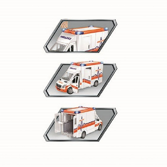 Auto sanitka s odnímatelnou střechou. Délka auta 27 cm, všechny dveře se dají otevřít. Světelné a zvukové efekty, které fungují po vložení 2xAA baterií, které nejsou součástí balení. Součástí sady jsou také nosítka.