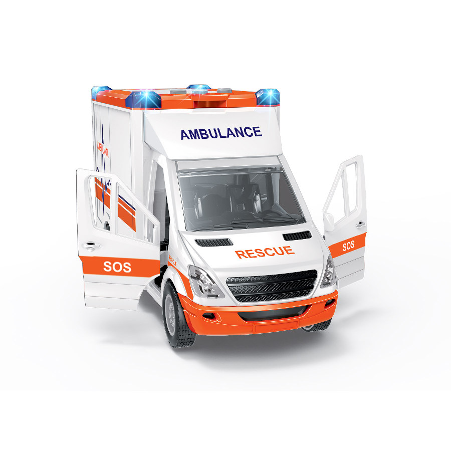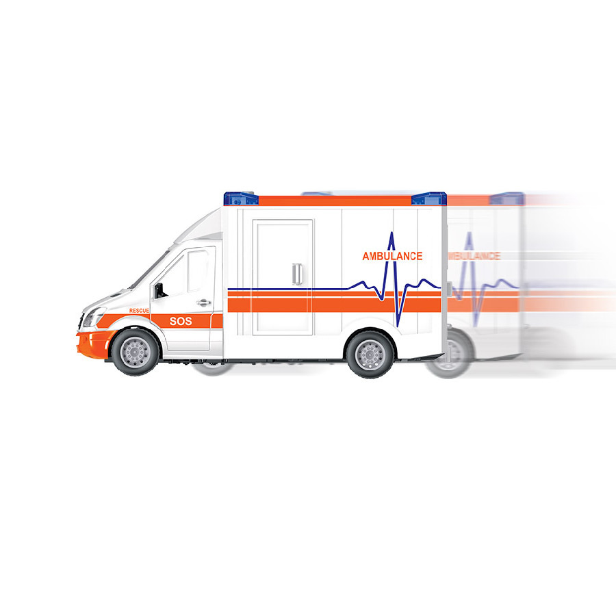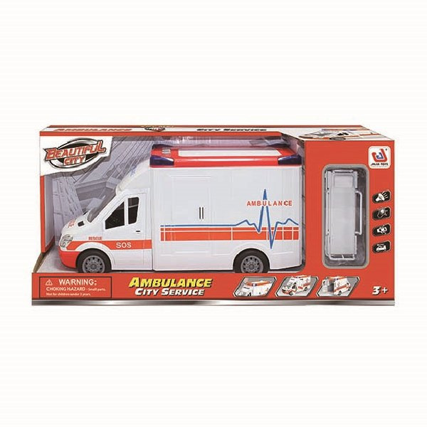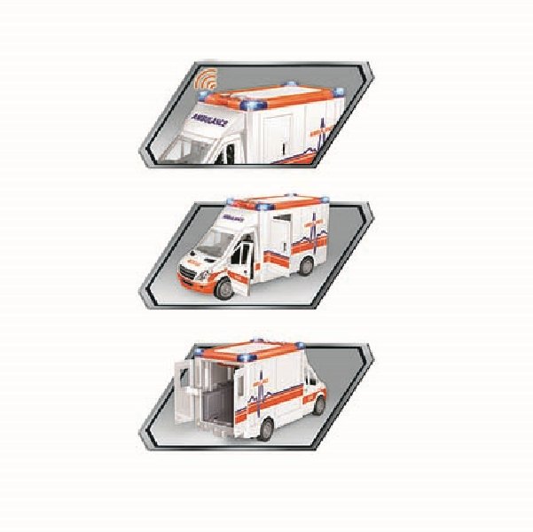 Auto sanitka s odnímatelnou střechou. Délka auta 27 cm, všechny dveře se dají otevřít. Světelné a zvukové efekty, které fungují po vložení 2xAA baterií, které nejsou součástí balení. Součástí sady jsou také nosítka.