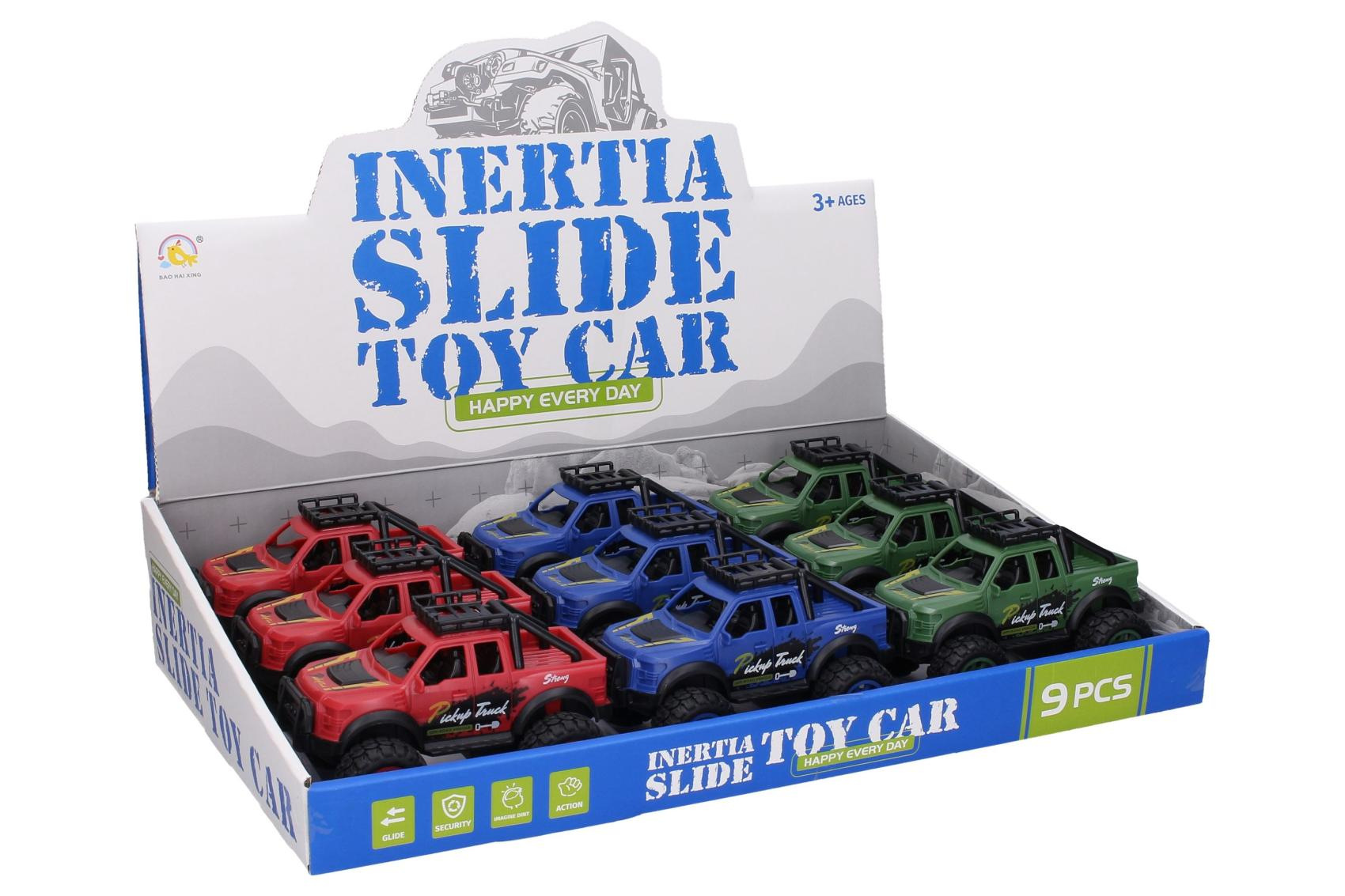 Auto terénní na setrvačník. Přesné rozměry auta 13x8,5x8 cm. Display box - 9 ks. 3 varianty - červená, modrá, zelená.