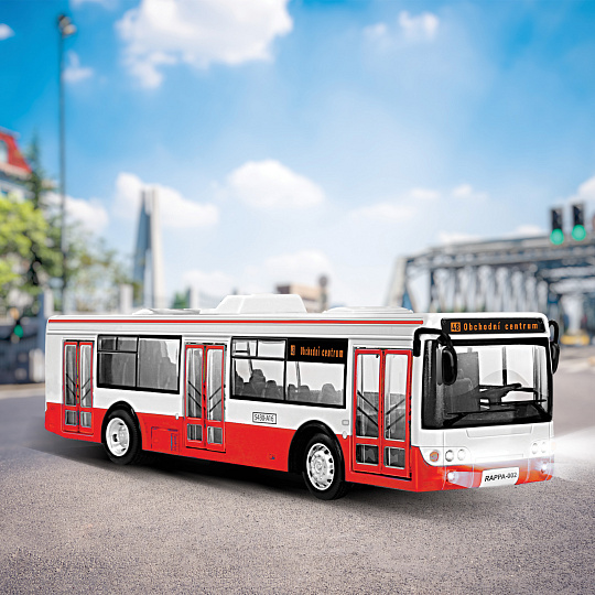 Originální autobus, který oznamuje stanice v českém jazyce, je rozhodně ten pravý dárek pro vaši jízdu! Vaše děti si ho zamilují! Dveře, lze manuálně otevřít a zavírají se pomocí tlačítka umístěného na střeše vozu. Při každém otevření se ozve hlášení, při zavření navíc blikají přední světla autobusu. Autobus v měřítku 1:43 je vyroben z plastu, jeho délka je 28 cm a vyžaduje použití 3 ks baterií LR44/AG13, které jsou jeho součástí. Autobus jezdí na zpětný chod. Potisk názvu stanice a číslo se může lišit od vyobrazení. Tahle unikátní hračka nadchne všechny kluky i holky!