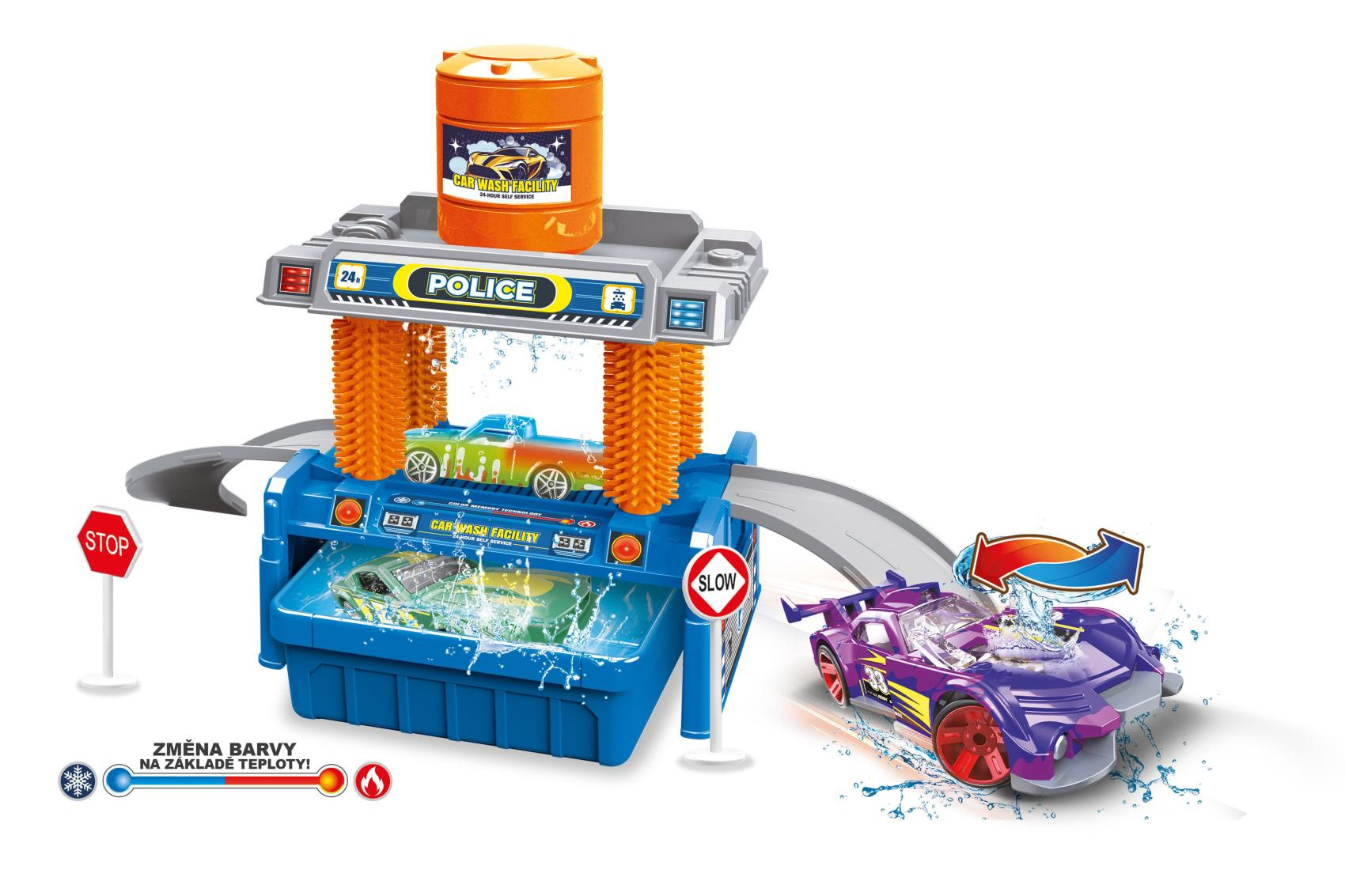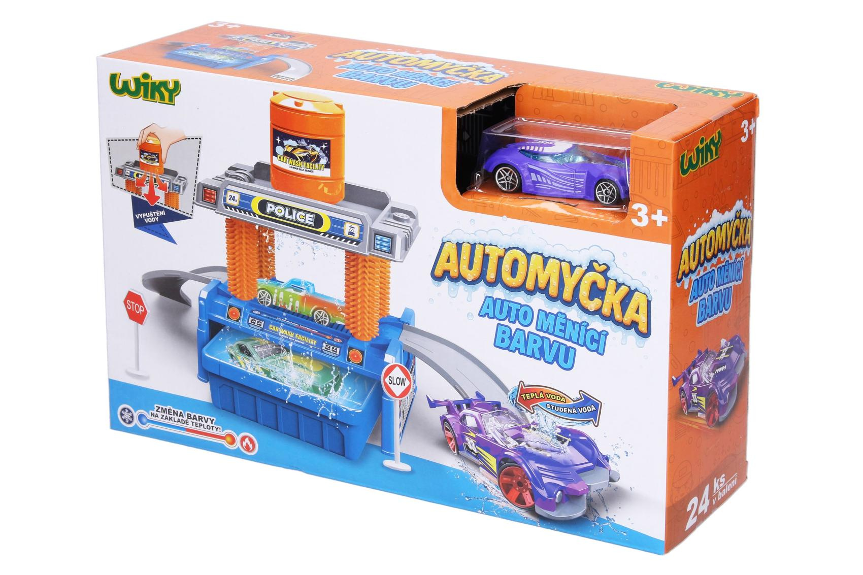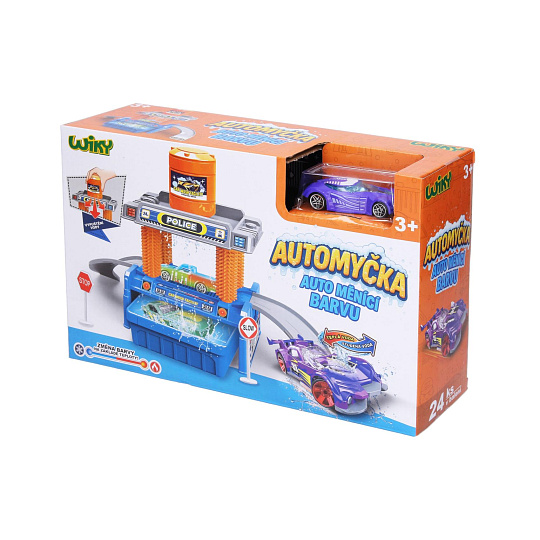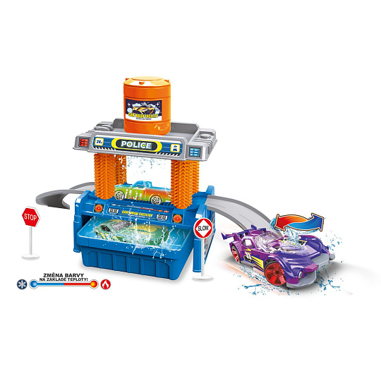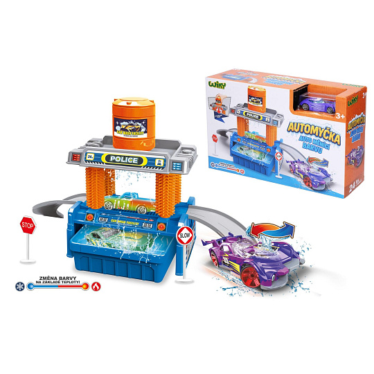 Auto měnící barvu podle teploty set s myčkou 35 cm. Rozměry myčky 35x16x24 cm. Auto 8 cm, volná kola. Auto mění barvu v závislosti na teplotě. Umyjte studenou vodou, nebo teplou vodou (více než 37°C). Nasajte do nádržky vodu (nádržka je měkká, zmáčknutím a uvolněním nasajete vodu). Nádržku umístěte na myčku a zmáčkněte. Obrázkový návod na sestavení na obalu.