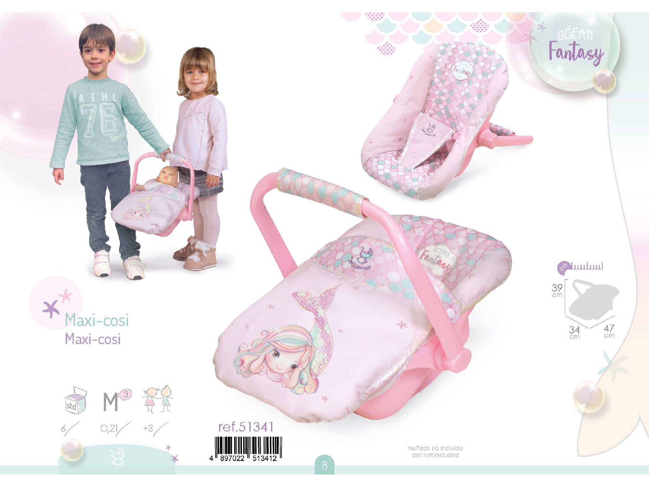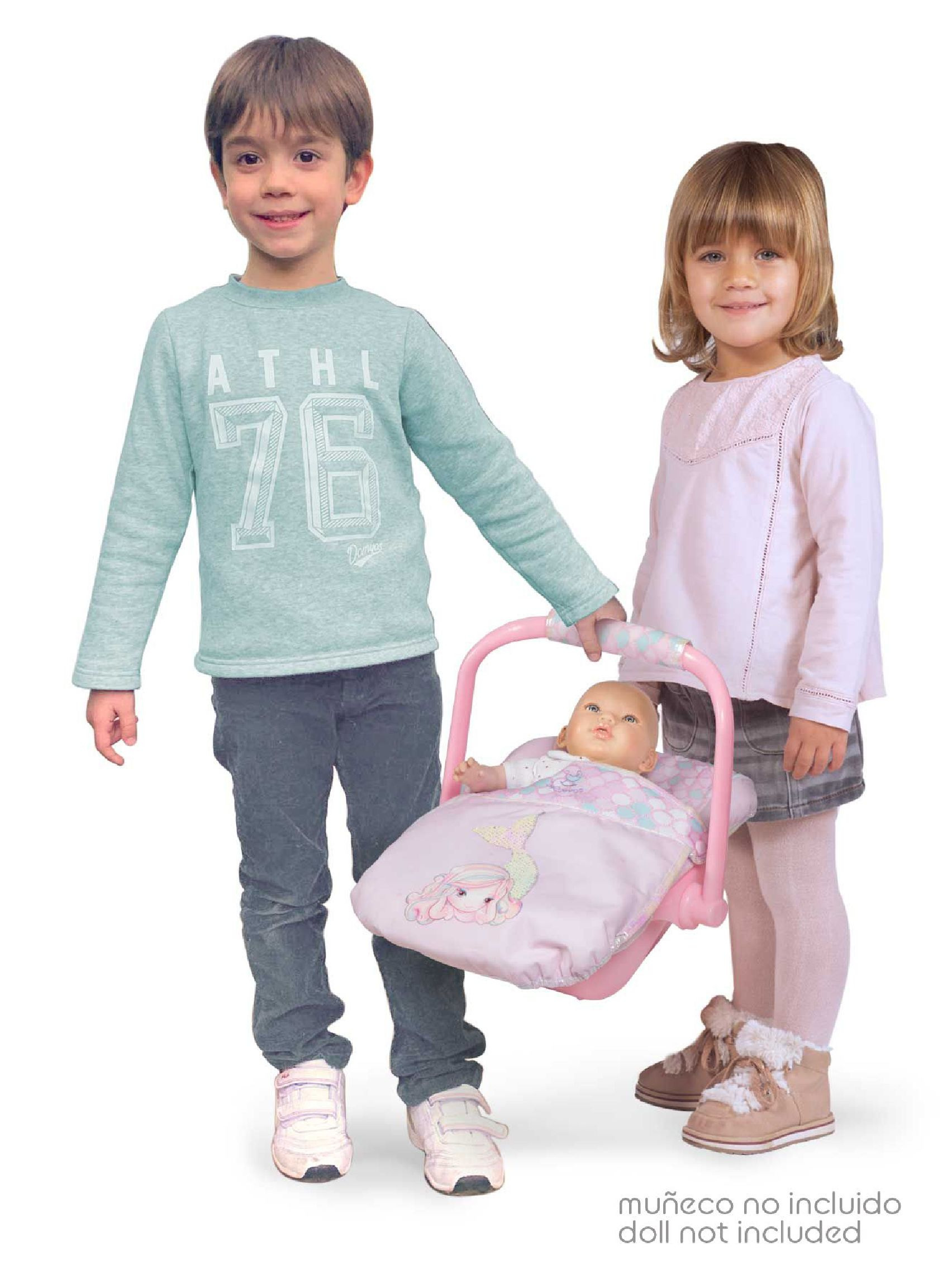 Panenka Evička se 2 roztomilými kočičkami a kočárkem s odnímatelným košíkem a doplňky. Velikost panenky 12 cm.