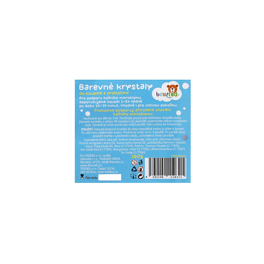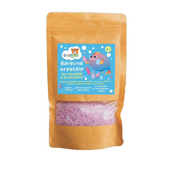 Barevné krystaly beauted šumí, barví vodu a zároveň pečují o jemnou dětskou pokožku. Obsahují probiotika podporující přirozenou ochranu pokožky. Obohaceny o minerály z mořské soli, ovesný extrakt a mandlový olej. Dermatologicky testováno – vhodné i pro citlivou dětskou pokožku. Český výrobek. Praktický uzavíratelný sáček pro snadné skladování a zachování čerstvosti. Barevné krystaly vytvoří ve vodě zábavný efekt a příjemnou vůni. Nasypte do teplé vody potřebné množství krystalů, sledujte jejich šumivý efekt a nechte se unést hravou atmosférou koupele.