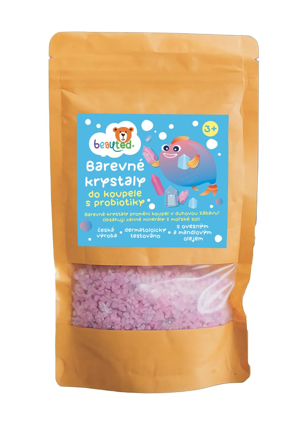 Barevné krystaly beauted šumí, barví vodu a zároveň pečují o jemnou dětskou pokožku. Obsahují probiotika podporující přirozenou ochranu pokožky. Obohaceny o minerály z mořské soli, ovesný extrakt a mandlový olej. Dermatologicky testováno – vhodné i pro citlivou dětskou pokožku. Český výrobek. Praktický uzavíratelný sáček pro snadné skladování a zachování čerstvosti. Barevné krystaly vytvoří ve vodě zábavný efekt a příjemnou vůni. Nasypte do teplé vody potřebné množství krystalů, sledujte jejich šumivý efekt a nechte se unést hravou atmosférou koupele.