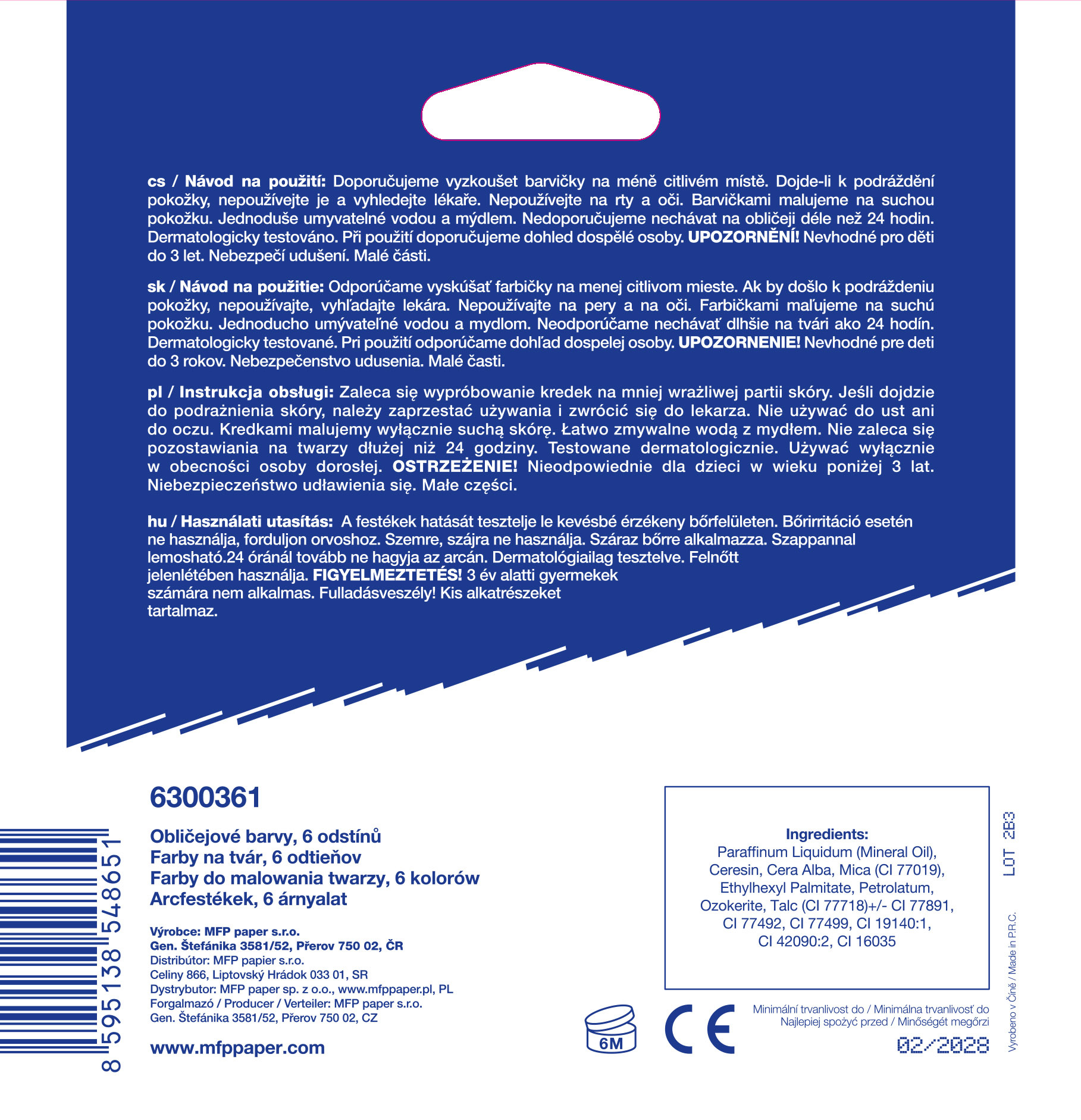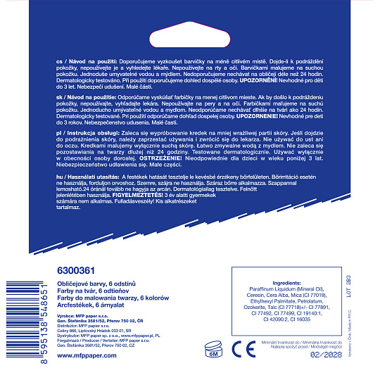 Barvy na obličej určené na líčení - Díky těmto pestrým barvám vykouzlíte na tváři dítěte krásnou masku na karneval, party nebo jinou oslavu. Barvy jsou dermatologicky testované.BALENÍ OBSAHUJE:- 6 barev (červená, černá, bílá, modrá, zelená, žlutá)- malý štětečekVAROVÁNÍ:Nevhodné pro děti do 3 let. Nebezpečí spolknutí malých částí.Uvedená cena je za 1 balení. Fandíme na mistrovství!