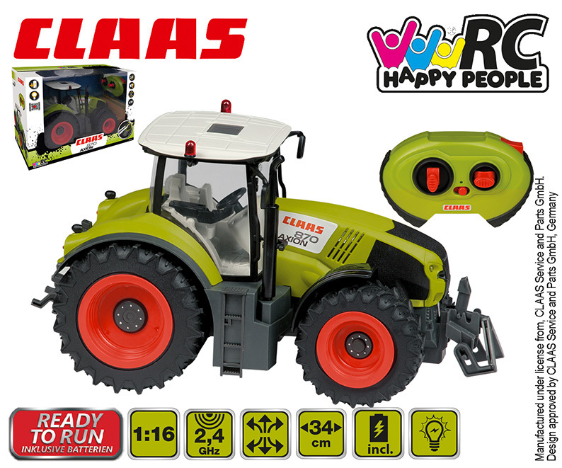 Traktor CLAAS je věrnou kopií skutečného traktoru. Má plnou funkci řízení a řazení. Funkční přední, zadní světla a otočná kola. Traktor je na dálkové ovládání s frekvencí 2,4 GHz. Traktor je na baterie 4xAA, ovladač 2xAAA. Baterie jsou součástí balení. Vhodné pro děti od 6 let.