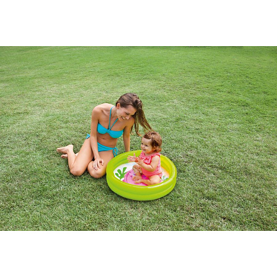 Bazének lze snadno rozložit a nafouknout a díky průměru 61 cm a výšce 15 cm ho můžete použít prakticky kdekoliv. Nafukovací bazének My First Pool od výrobce Intex je určen primárně pro děti od 1 do 3 let, čemuž je přizpůsoben i jeho veselý dětský design. Bazének je vyroben z odolného vinylu a má dvě nafukovací komory. Součástí balení je opravná sada na drobná poškození. Je také vhodný i do malých prostor jako je balkón, terasa, atd. Objem 17 litrů při výšce vodní hladiny 8 cm. Snadné rozložení a sbalení Rozměry balení 25 x 30 x 2 cm.