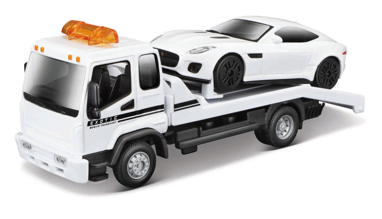 Bburago – STREET FIRE, Odtahové vozidlo Flatbed Tow Truck + Jaguar F-TYPE Coupé, 1:43