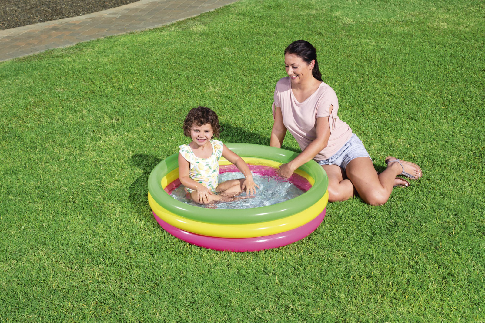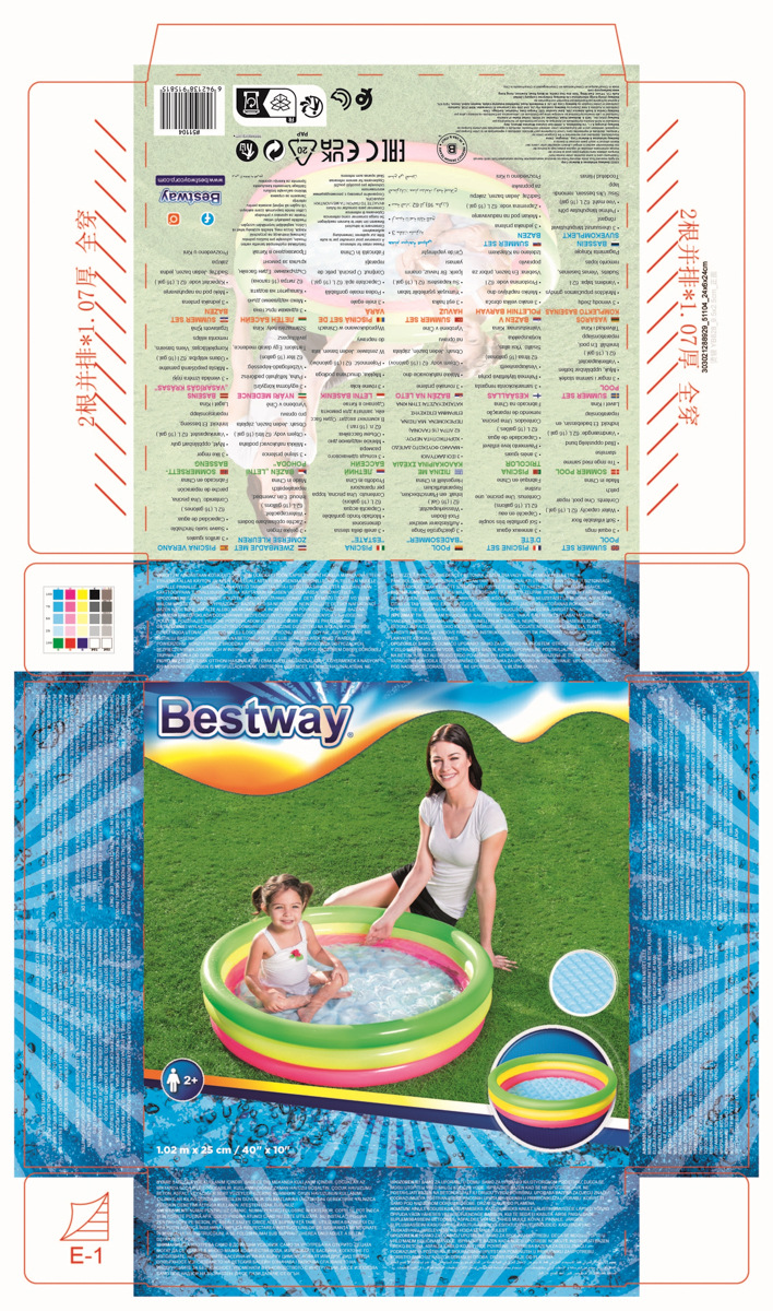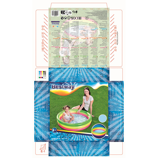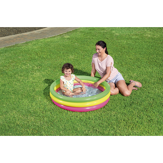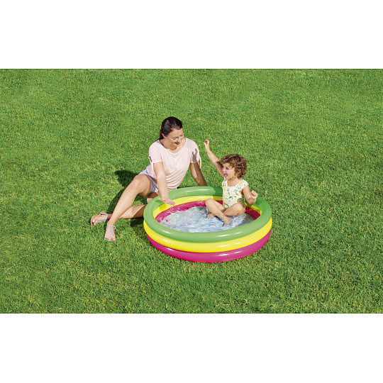 Duhový nafukovací bazének Bestway v růžovo-žluto-zeleném provedení je ideální pro osvěžení malých dětí. Skládá se ze 3 stejných kruhů, které jsou vhodné také jako opěra dětí. Bazének má pohodlnou, měkkou, nafukovací podlahu. Vyrobeno z bezpečného a odolného vinylu. Bezpečnostní ventily. Obsahuje: 1 nafukovací bazének, 1 opravná sada. Max. kapacita: 41 l. Rozměr: 70 x 24 cm. Rozměr balení: 15 x 19,8 x 5,5 cm. Věk: 2+. Užívání vždy pod dohledem dospělé osoby.