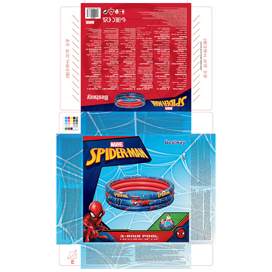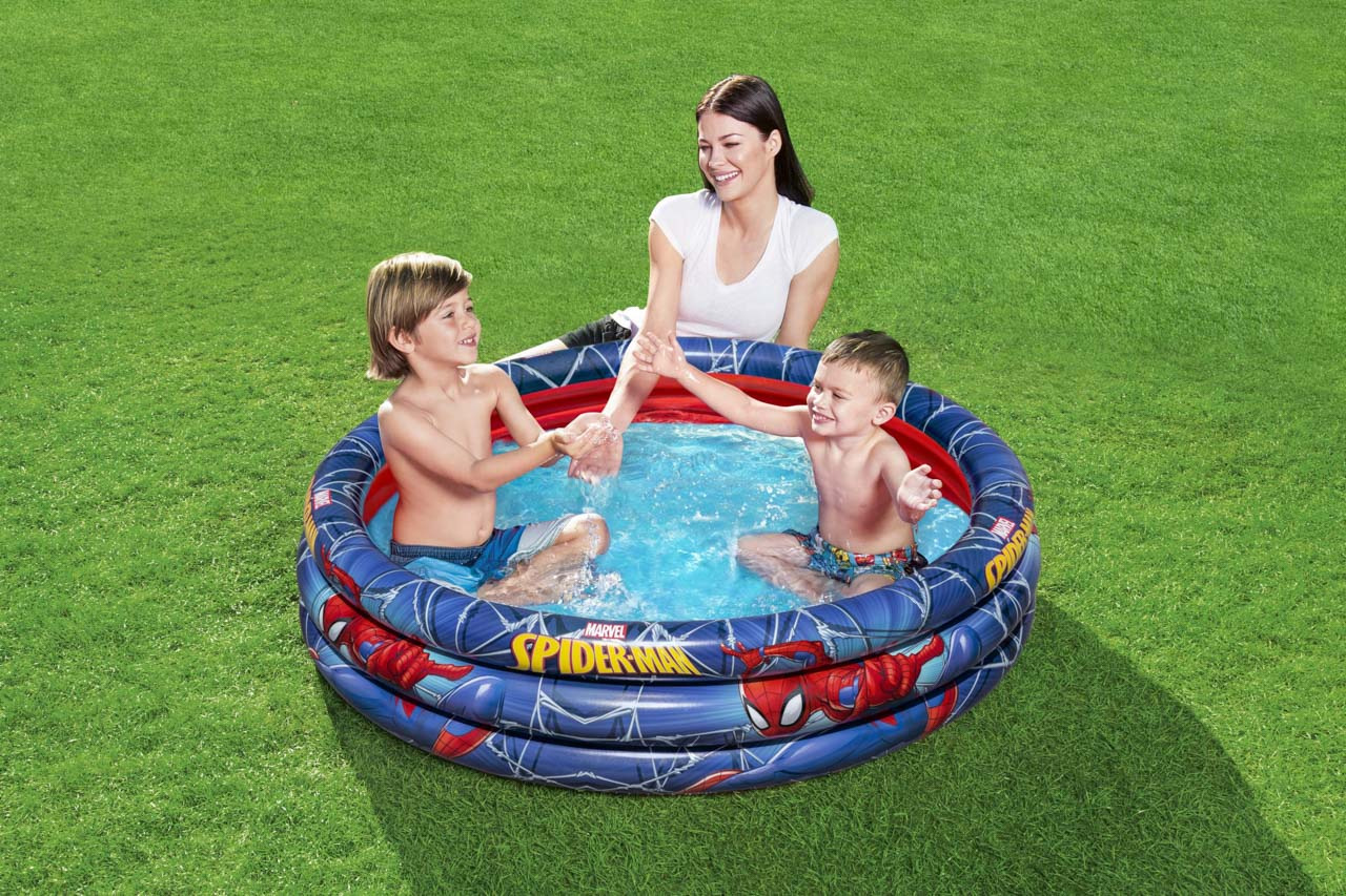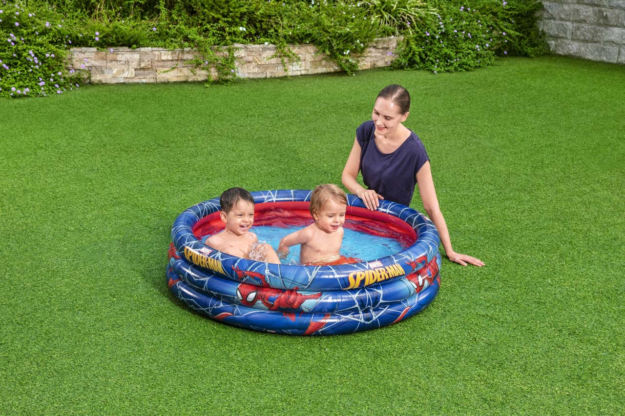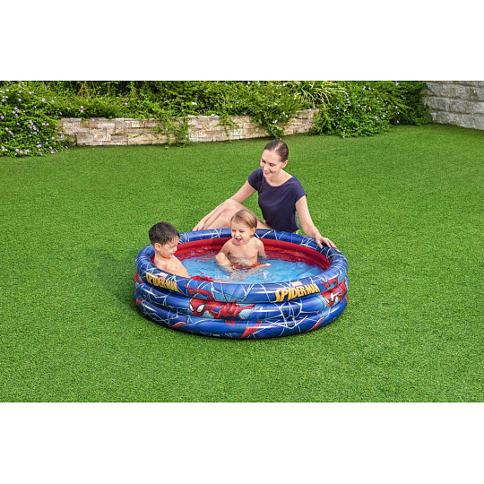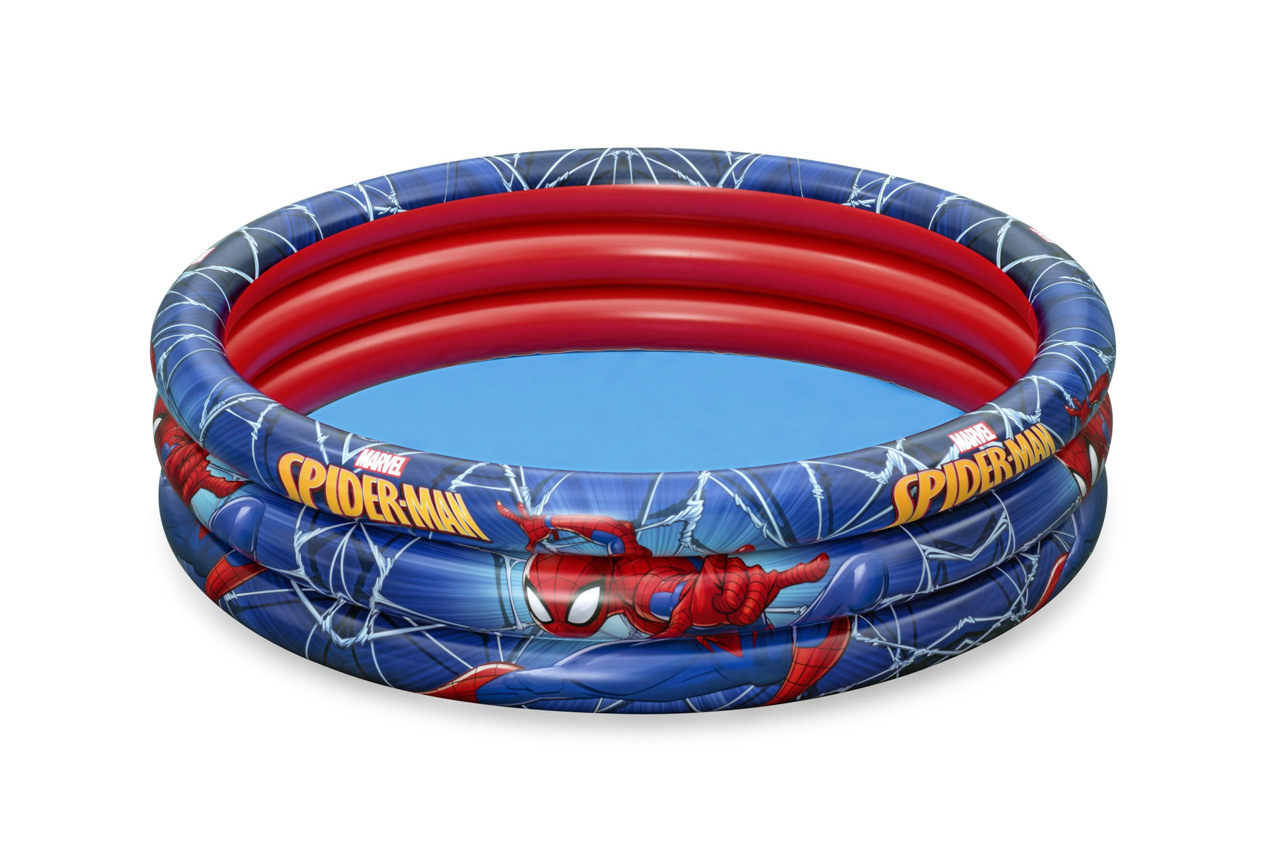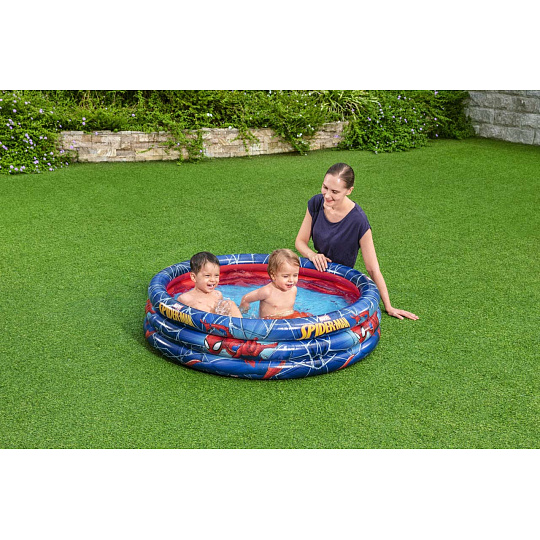 Nafukovací bazének Spiderman, průměr 122 cm, výška 30 cm. Bezpečnostní ventily. Pevný a předem otestovaný vinyl. 3 stejné prstence. Přiloženy záplaty. Navržený objem vody: 200 litrů. Obsah: Jeden bazén, záplata pro opravu. Použití pouze pod dohledem dospělé osoby. Rozměr balení: 24 x 5,5 x 24 cm. Věk: 2+.