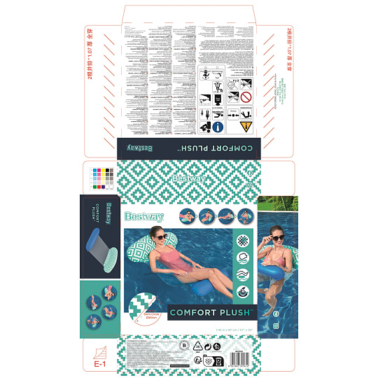 Bestway® Nafukovací lehátko s povrchem Color Shield™ a síťkou. Příjemná síťovina CoolDown™ je opatřena trvanlivým potahem, který brání jejímu poškození. Povrchová úprava Color Shield™ zabraňuje vyblednutí a změně barvy povrchu. Tvárná konstrukce – možné použití jako rovná nafukovací matrace, bazénové křeslo, nebo houpací síť. Lehátko má dvě vzduchové komory a pojistné ventily. Včetně opravné záplaty. Nafouknutá velikost: 22 x 81 x 114 cm. Nenafouknutá velikost: 87 x 140 cm. Rozměry balení: 19,8 x 19,8 x 4 cm. Určeno pro 1 osobu. Maximální nosnost: 100 kg. Věk: 14+