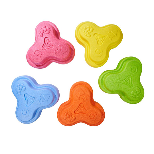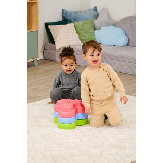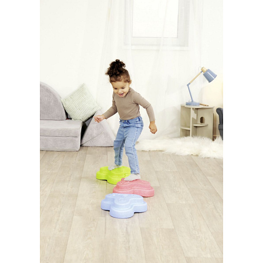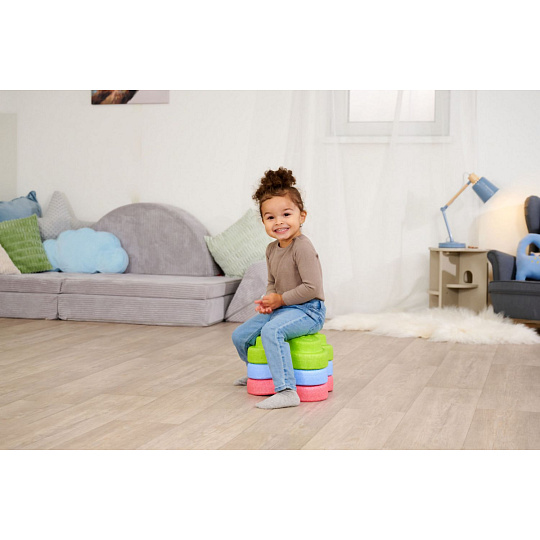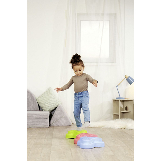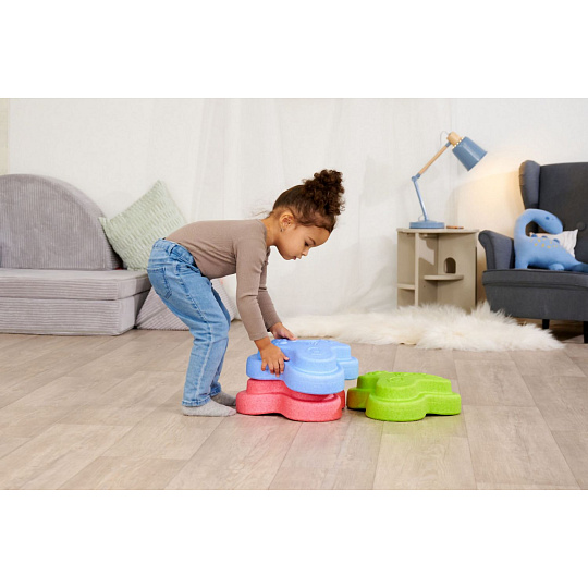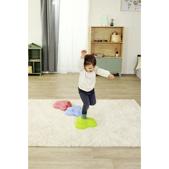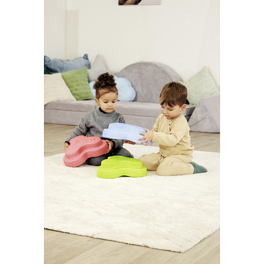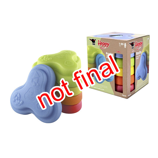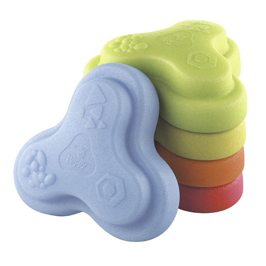 Sada 5 balančních nášlapných kamenů pro děti- v červené, modré, zelené, oranžové a žluté barvě - Měkké kostky se strukturovaným povrchem pro hmatovou hru a stavění. Tyto barevné hrací kameny byly speciálně vyvinuty pro batolata od 12 měsíců a hravou formou podporují smyslové vnímání, motorický vývoj a smysl pro rovnováhu. Vyrobeno z EPP: 90 % vzduchu, 10 % materiálu. Obzvláště robustní a extrémně lehké. Tři různé povrchové textury, kameny unesou zatížení až 120 kg. Díky svému materiálu jsou Heppy Rocks teplejší než jiné plastové hračky, snadno se čistí, jsou odolné vůči slinám a potu a ideální pro použití uvnitř i venku.