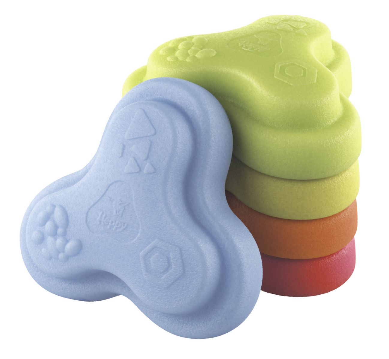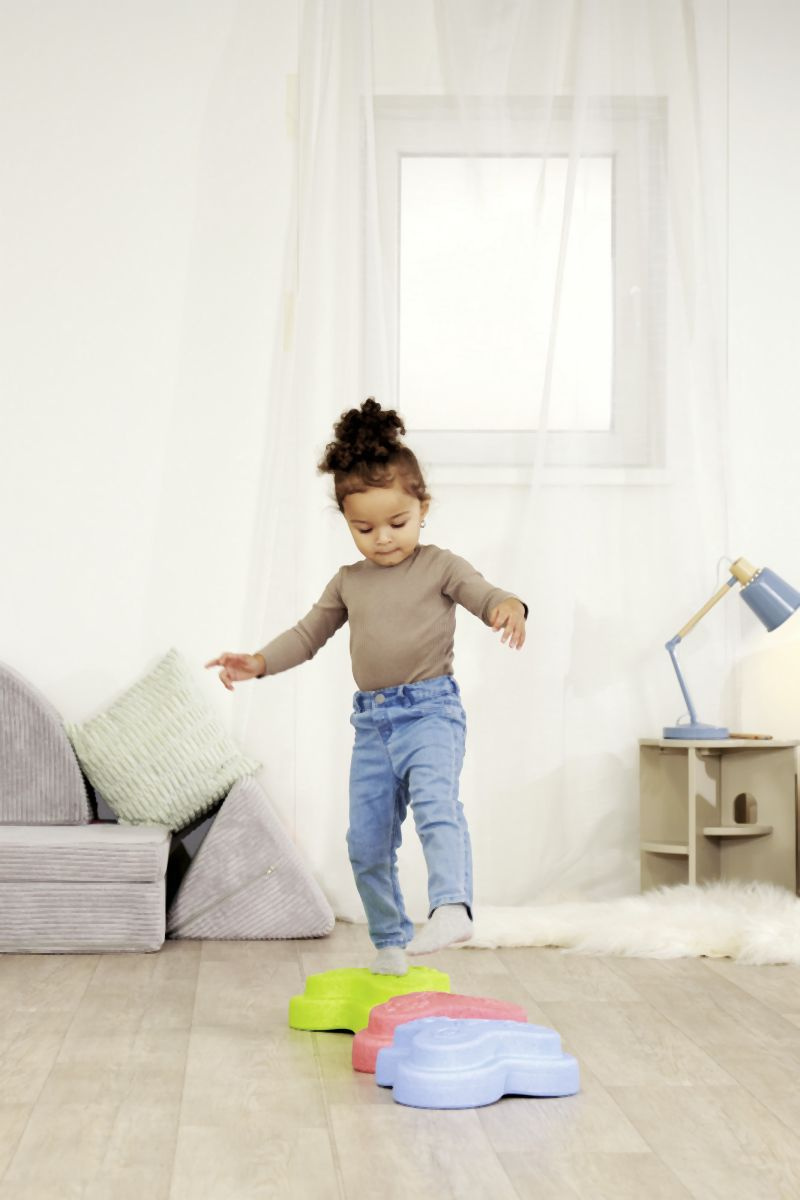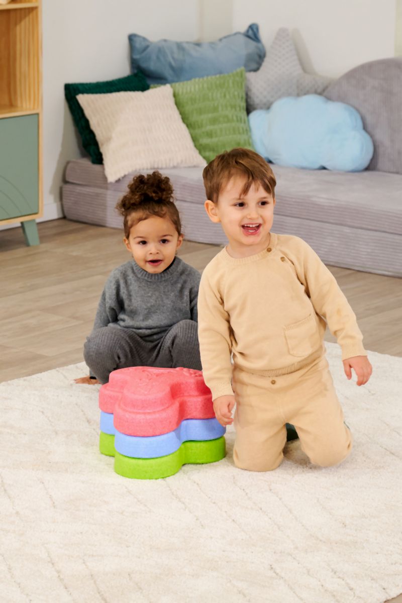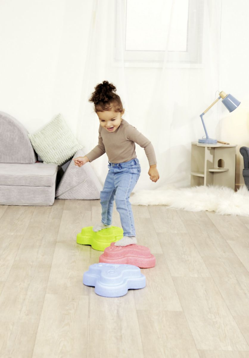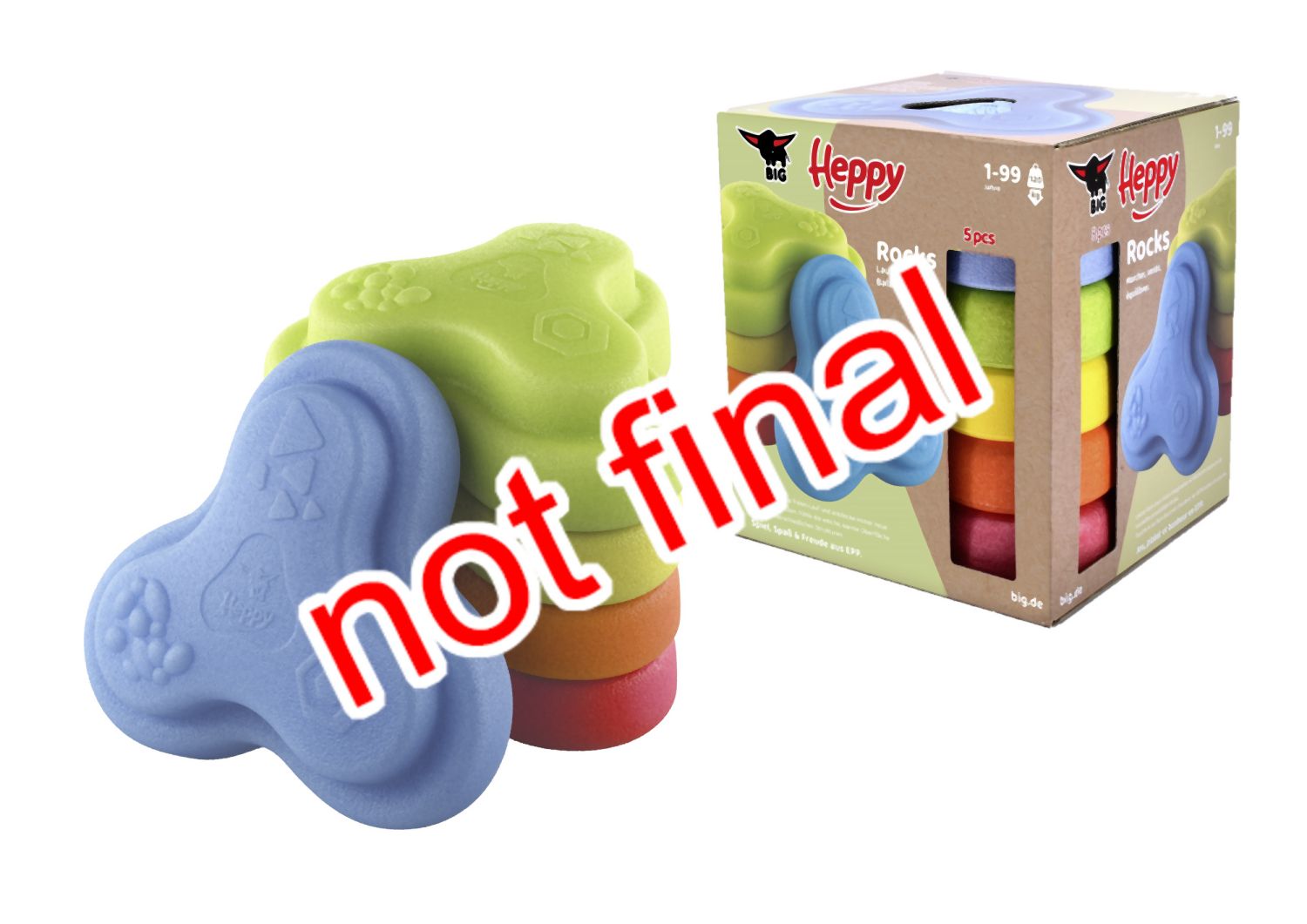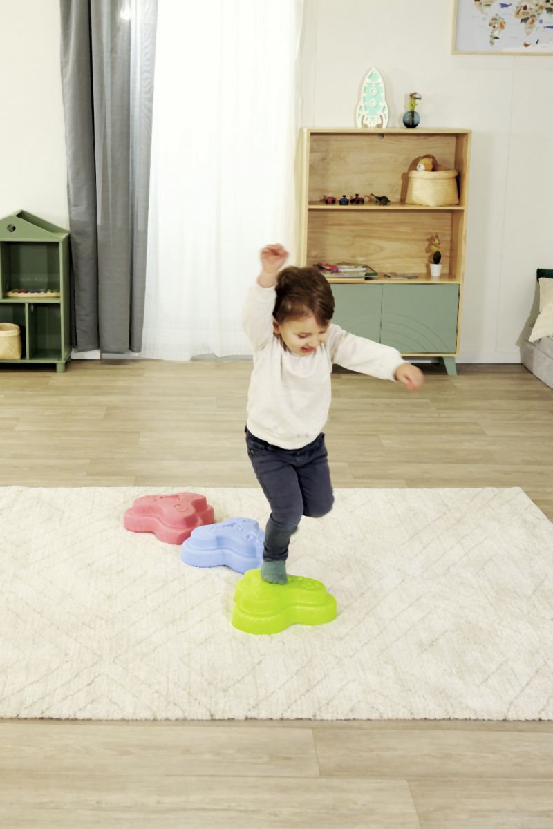 Sada 5 balančních nášlapných kamenů pro děti- v červené, modré, zelené, oranžové a žluté barvě - Měkké kostky se strukturovaným povrchem pro hmatovou hru a stavění. Tyto barevné hrací kameny byly speciálně vyvinuty pro batolata od 12 měsíců a hravou formou podporují smyslové vnímání, motorický vývoj a smysl pro rovnováhu. Vyrobeno z EPP: 90 % vzduchu, 10 % materiálu. Obzvláště robustní a extrémně lehké. Tři různé povrchové textury, kameny unesou zatížení až 120 kg. Díky svému materiálu jsou Heppy Rocks teplejší než jiné plastové hračky, snadno se čistí, jsou odolné vůči slinám a potu a ideální pro použití uvnitř i venku.