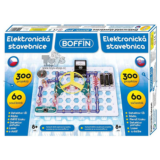 Elektronická stavebnice Boffin 300 obsahuje 60 součástek, z nichž lze postavit tyto projekty: