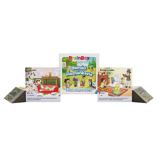 Hra BrainBox Domácí mazlíčci obsahuje 55 hracích karet s ručně malovanými ilustracemi, které doslova oživí domácí mazlíčky na obrázkové straně karet.