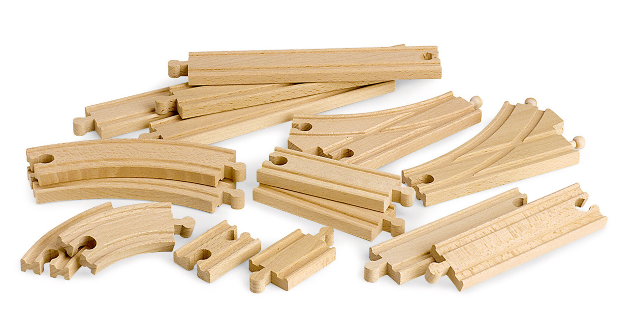 Set obsahuje 16 dílů různých kolejí k vláčkodráhám: 4 dlouhé rovné, 2 středně dlouhé rovné, 2 krátké rovné, 2 výhybky, 2 krátké zatáčky, 2 dlouhé zatáčky a 2 speciální spojovací koleje se stejnými spojovacími prvky (čudlík - čudlík, dírka - dírka). Koleje jsou vyrobeny z kvalitního bukového dřeva.