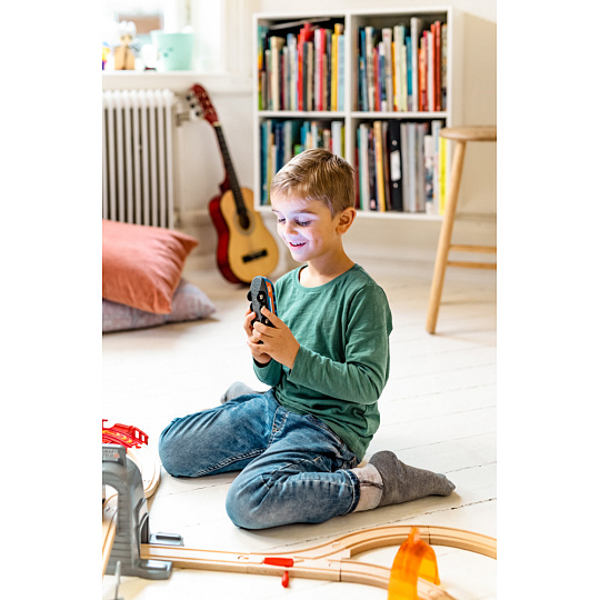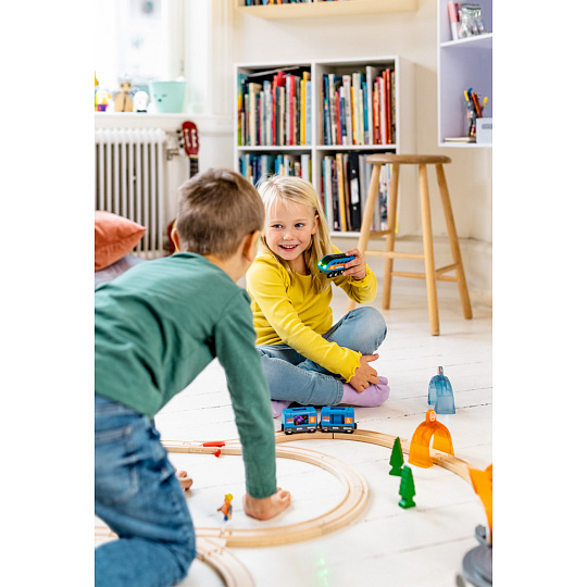 Stačí se pohodlně posadit, uchopit ovládací panel, kterým ovládáme chod vpřed i vzad.Poslouží při rychlé přepravě lidí, nebo těžkého nákladu. Před žádným terénem se nezastaví, strmé kopce a prudké sjezdy zvládá s elegantní lehkostí. Zůstane stát nebo se rozjede přesně tam, kde je potřeba. Lokomotiva je kompatibilní s dřevěnými vláčkodráhami Brio